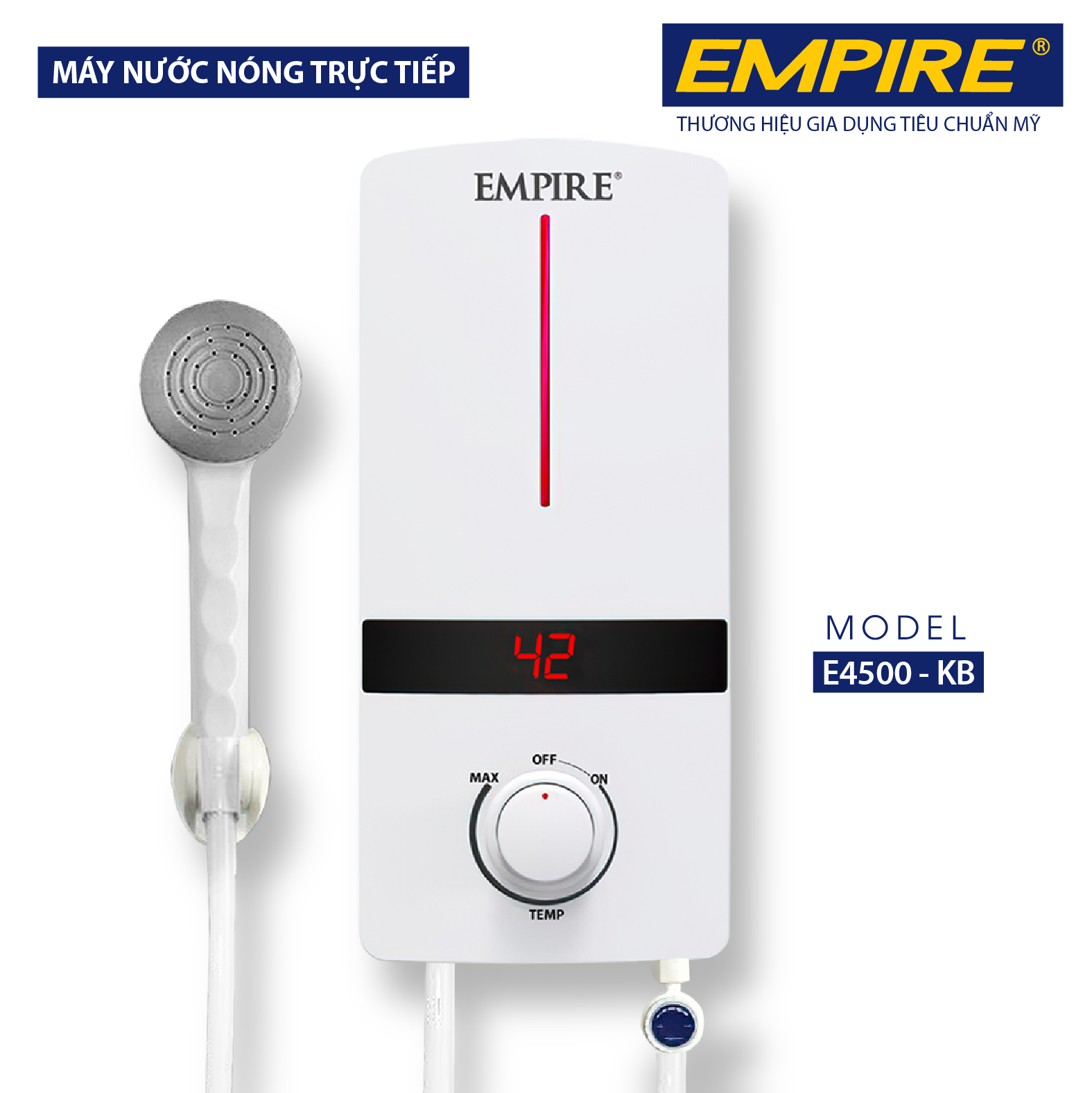 Máy nước nóng trược tiếp EMPIRE Model: E4500-KB Hiển thị nhiệt độ và điều chỉnh nhiệt độ. Không bơm trợ lực phù hợp cho những căn hộ có áp xuất nước mạnh không cần dùng