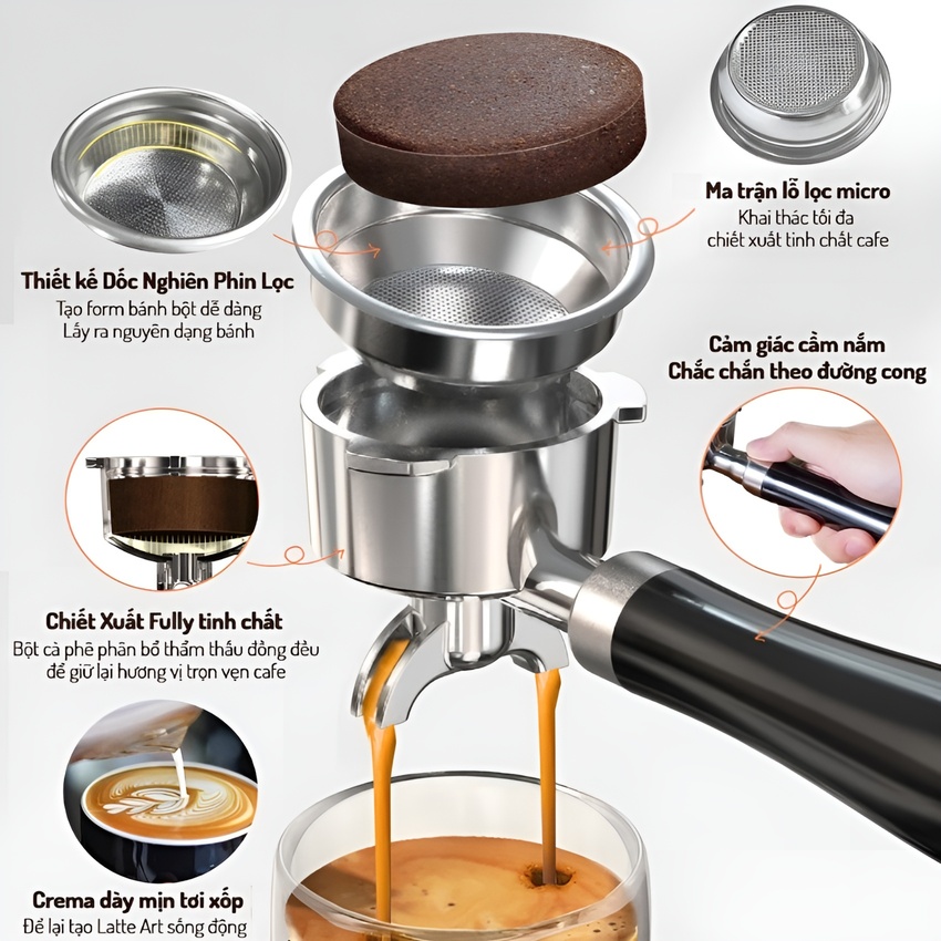 - Bộ phụ kiện bao gồm: 1 thân máy, 3 phin lọc inox, 1 tay cầm tiêu chuẩn 51mm, 1 thìa múc kiêm nén,1 sách HDSD