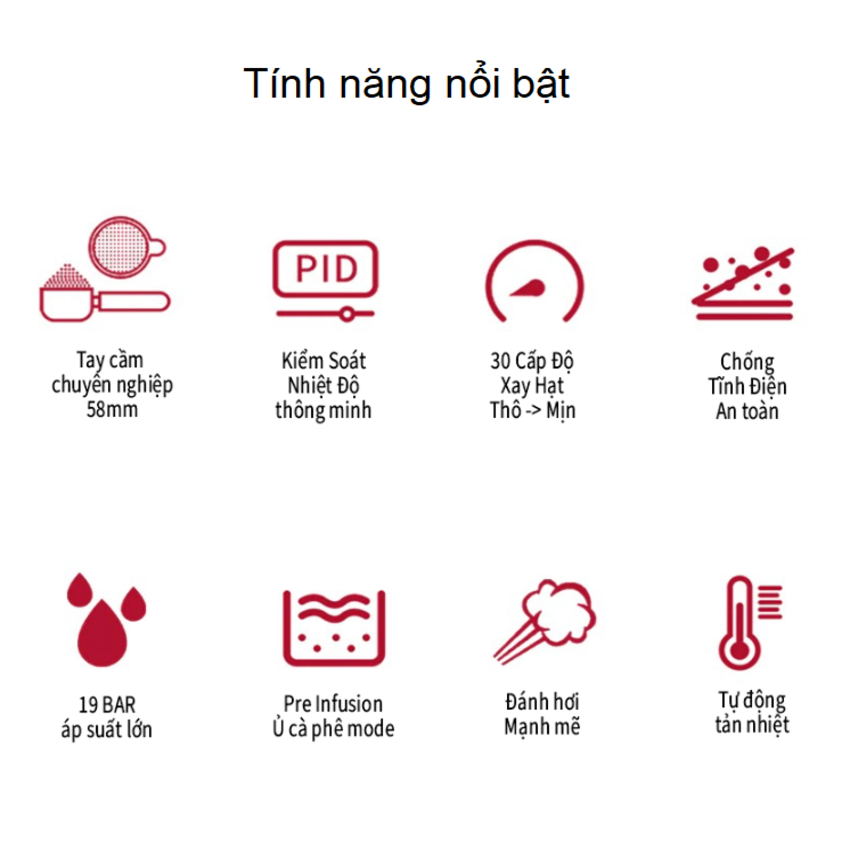 - Chức năng pha cà phê: Cappuccino, Espresso, Latte