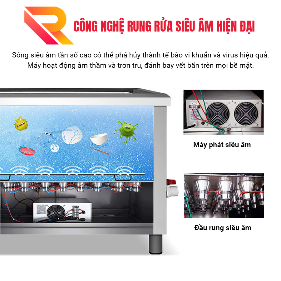 - Dung tích bồn rửa : 108L Vì sao tần số 40kHz được ứng dụng phổ biến trong hầu hết các dòng bể rửa siêu âm? Nếu bạn đã từng dành thời gian để tìm hiểu về thiết bị làm sạch bằng sóng siêu âm Rama Việt Nam, bạn sẽ nhận thấy trong hầu hết sản phẩm của chúng tôi, tần số 40kHz được sử dụng. Vì sao vậy? Dựa trên kết quả nghiên cứu thực tế, các kỹ thuật viên của Rama nhận thấy, tần số siêu âm thấp phù hợp để làm sạch đồ dùng kích thước lớn, bề mặt nhẵn. Ngược lại, tần số siêu âm lớn phù hợp để làm sạch đồ dùng kích thước nhỏ, nhiều chi tiết. Tần số 40kHz được cho là tần số trung bình, chúng có thể mang đến hiệu quả cho cả 2 loại đồ vật trên. Vì vậy, với mong muốn mang đến sản phẩm tiện ích, phù hợp với đa số người dùng, Rama lựa chọn đầu tạo sóng siêu âm tần số 40kHz cho các sản phẩm của mình. Ngoài các sản phẩm được có đầu sò tần số siêu âm cố định, tại Rama, chúng tôi cũng cung cấp thiết bị có khả năng thay đổi tần số siêu âm, sản xuất thiết bị có tần số theo yêu cầu thực tế của khách hàng. 6 LÝ DO NÊN CHỌN MÁY RỬA BÁT SIÊU ÂM RAMA