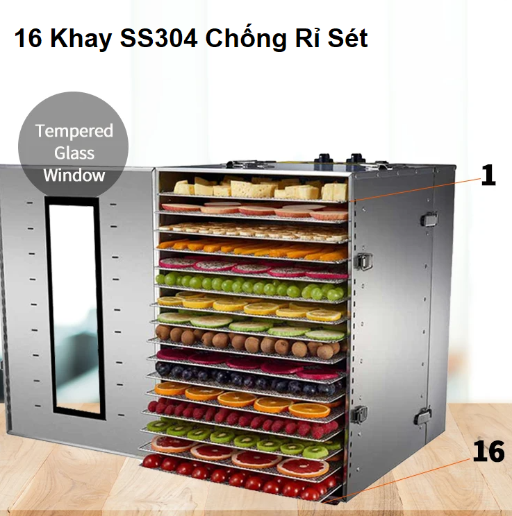 - Hệ thống gia nhiệt tự động 360 độ vòng quanh cho 16 khay lưới inox, giúp thực phẩm được sấy chuyên nghiệp rất đều và thơm ngon.