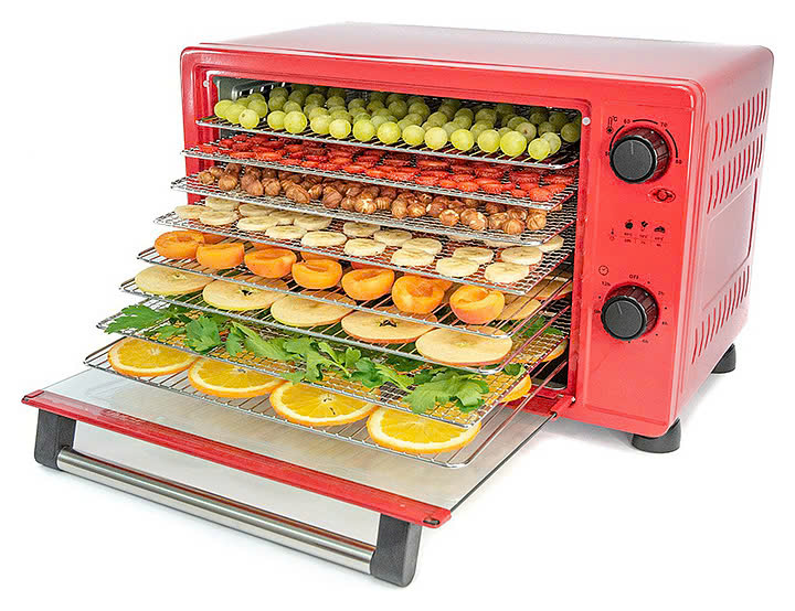 Máy sấy rau củ quả được thiết kế để sấy khô trái cây, rau củ, nấm, thảo mộc, thịt và các sản phẩm khác trong căn hộ, nhà riêng, quán cà phê và nhà hàng. Mô hình được trang bị bảng điều khiển cơ và 4 chân. Thân và khay sấy làm bằng kim loại, cửa tủ làm bằng kính cường lực.