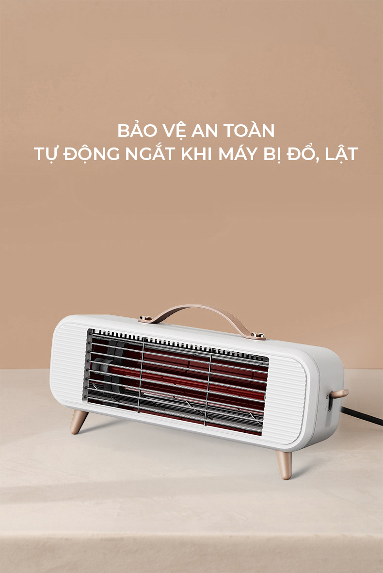 Thiết kế nhỏ gọn, tiện dụng Sưởi ấm nhanh, không gây tiếng ồn 3 mức phát nhiệt Có tính năng quay đảo hướng phát nhiệt, phạm vi phát nhiệt rộng Lưới tản nhiệt thiết kế