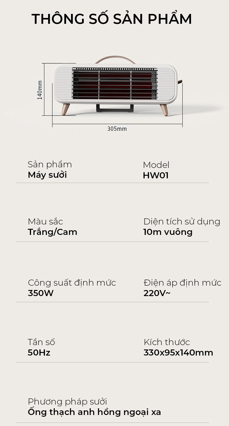 - Máy sưởi phòng hồng ngoại 350W sưởi ấm cực nhanh, nhỏ gọn, sưởi ống thạch anh, an toàn chống cháy - Model: HW01 - Phương pháp sưởi: Hồng ngoại - Làm nóng gần như ngay lập tức - Sử dụng ống thạch anh làm nóng cho hiệu suất tỏa nhiệt lớn dù công suất nhỏ, tiết kiệm điện - Thiết kế an toàn tự động ngắt khi bị đổ, lật - Vỏ chống chịu nhiệt độ cao, chống cháy nổ - Khởi động 1 thao tác đơn giản - Không tiếng ồn khi hoạt động, không ảnh hưởng tới giấc ngủ cũng như công việc - Cực nhẹ chưa đến 1Kg, có quai xách thuận tiện di chuyển - Màu sắc tinh tế tạo điểm nhấn cho căn phòng của bạn - Thích hợp phòng kín, khuyến nghị diện tích 10 mét vuông.