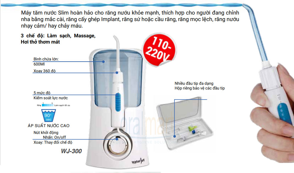 - Chế độ nước nhẹ nhàng dành cho nướu nhạy cảm 4 đầu tip đa chức năng: đầu tăm tiêu chuẩn, đầu tăm cho răng niềng, đầu cạo lưỡi, đầu vệ sinh túi nha chu.