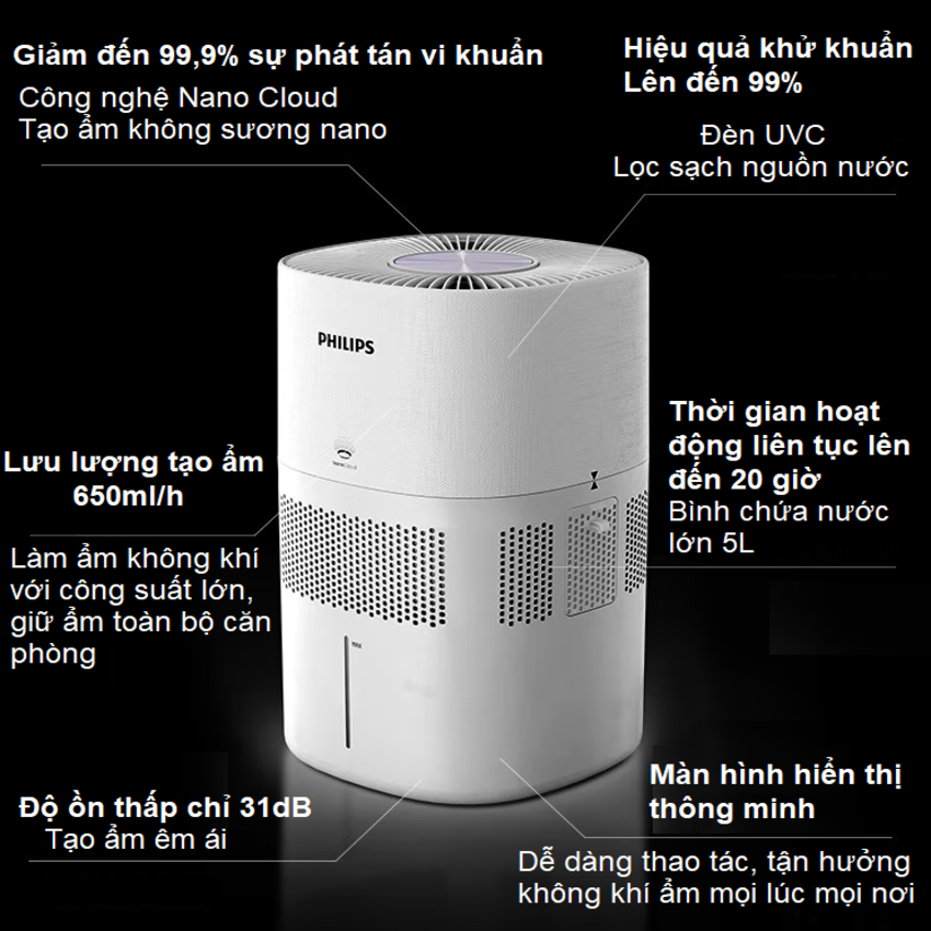 - Máy phun sương 360 độ khuếch tán đều không khí ẩm khắp phòng. Hơi nước NanoCloud siêu mịn mang nhiều độ ẩm hơn và ngăn quá trình bão hòa, đặc biệt là để tạo độ ẩm hiệu quả trong không gian rộng Không có sương trắng hoặc tích tụ nước