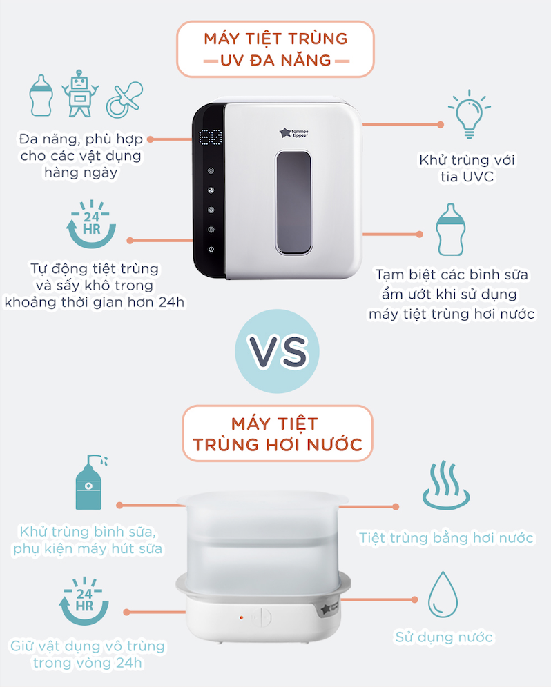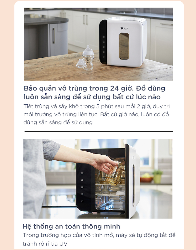 Máy tiệt trùng UV và sấy khô Tommee Tippee tích hợp các tính năng thông minh và dễ dàng tiệt trùng, sấy khô và bảo quản bình sữa và các phụ kiện, nhờ đó bạn có thể bảo vệ cái bụng nhỏ xinh của bé luôn được an toàn. Tia cực tím (UV) là một dạng ánh sáng bước sóng ngắn mắt thường không nhìn thấy, có thể tiêu diệt 99.9% các vi sinh vật, vì vậy đây là cách thức hiệu quả để loại trừ vi khuẩn có hại, nấm mốc, virus và các mầm bệnh khác mà không cần dùng đến chất hóa học.