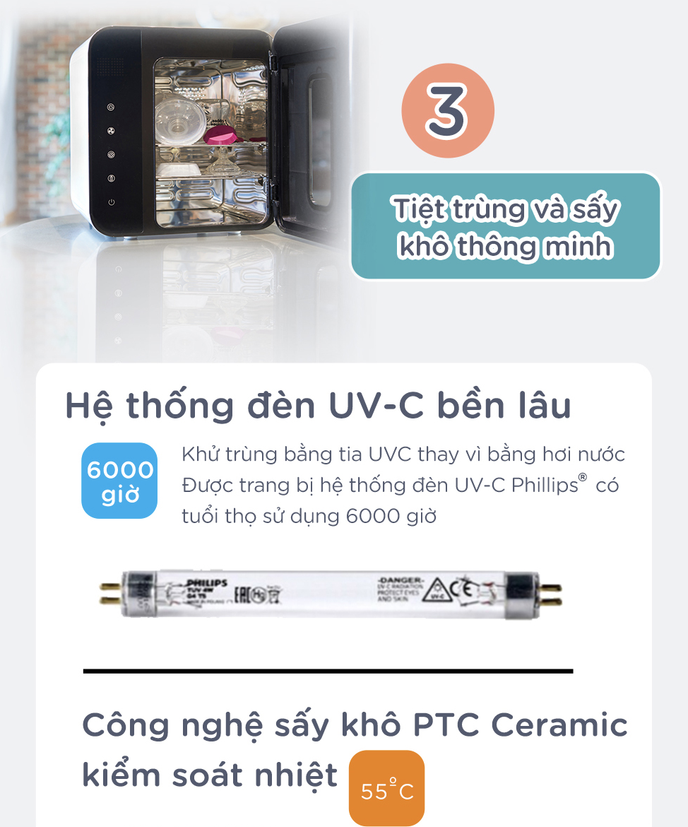 Tiệt trùng và sấy khô 6 bình sữa cổ rộng (9 bình sữa cổ hẹp) trong 60 phút, rất tiện lợi và siêu sạch.