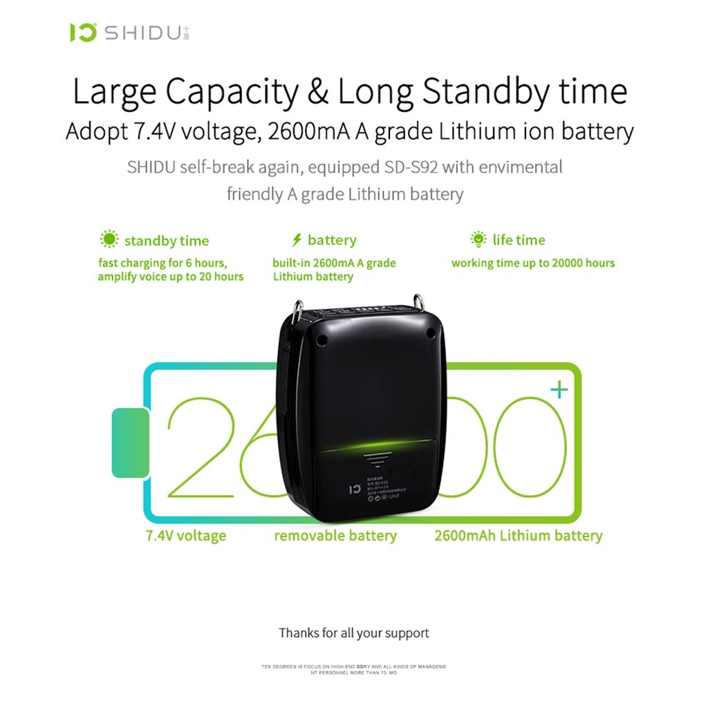 - Máy trợ giảng UHF Shidu-S92 sử dụng công nghệ không dây UHF wireless để kết nối giữa loa và micro.