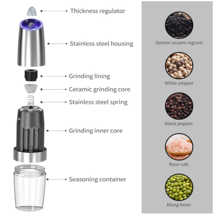 - Thực phẩm gia vị dễ dàng khi bạn nấu hoặc cầm một cái gì đó trong tay khác, tận hưởng sự tiện lợi và tốc độ nhanh chóng của Máy Nghiền Hạt Tiêu trọng lực của chúng tôi.
