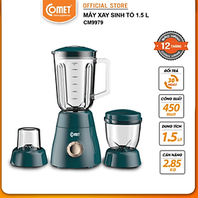 -  Máy xay sinh tố Comet CM9979 có kiểu dáng hiện đại, màu sắc sang trọng trẻ trung, phù hợp với mọi gian bếp.  -  Hoạt động với công suất 450 W cực mạnh, động cơ máy vận hành êm ái, dễ dàng xay nhuyễn các loại thực phẩm và ngay cả đá một cách nhanh chóng. Ngoài ra, Máy xay sinh tố Comet CM9979 còn được thiết kế với các nút điều khiển để tăng công suất: Từ 0 đến 2 tương ứng với công suất tăng lên. Nút P có công dụng nhồi đáp ứng đa dạng các nhu cầu trong gia đình.  -  Máy xay sinh tố Comet CM9979 có tổng cộng 3 cối với cối lớn và cối nhỏ được làm từ chất liệu thủy tinh sáng bóng, cối trung được làm từ nhựa cao cấp, có khả năng chống chịu nhiệt tốt. Vì thế khi xay thực phẩm nóng, máy sẽ không tiết ra các chất độc hại và mùi hôi ám mùi lên thực phẩm. -  Cối xay lớn với lưỡi dao thép không gỉ và dung tích lớn giúp bạn có thể tự xay cho gia đình mình những ly sinh tố thơm ngon. -  Cối xay trung có lưỡi dao thép 4 cánh với phần đế dễ dàng tháo lắp được thiết kế dành riêng cho thực phẩm ướt như thịt, cá, hành, tỏi… rất tiện lợi khi gia đình bạn có em bé đang trong độ tuổi ăn dặm. -  Cối xay nhỏ chuyên xay thực phẩm khô như đậu hạt, tiêu, quế, hồi… một cách dễ dàng và nhanh chóng, giúp bạn tiết kiệm được thời gian làm bếp.