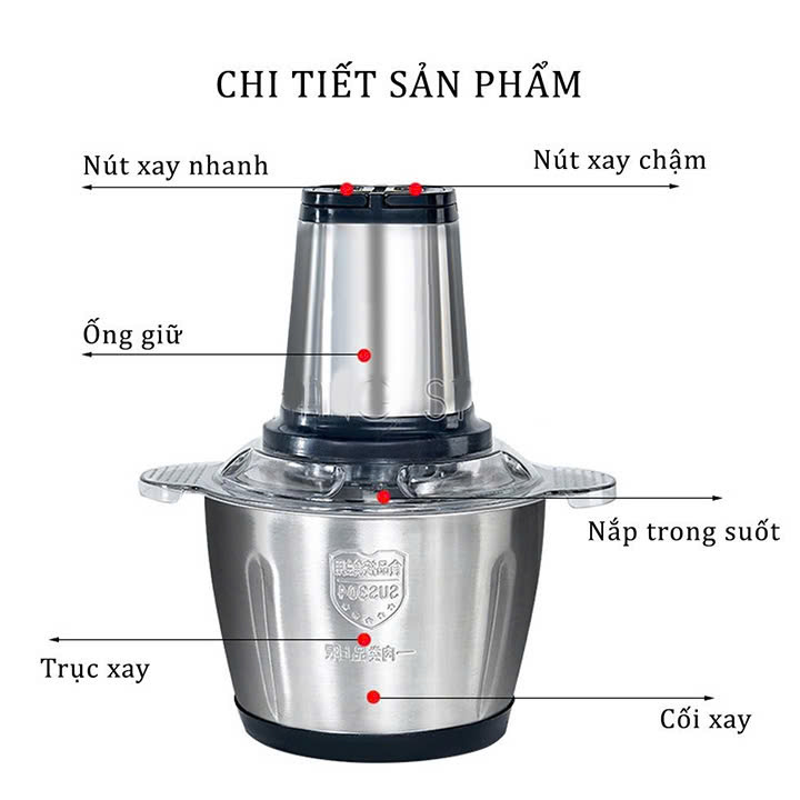 Mua tại TiktokDung tích: 2L Công suất: 250W Nguồn điện : 220v- 50Hz Vỏ máy: Chất liệu Inox 304 cao cấp, chịu nhiệt Lưỡi dao: Thiết kế 4 lưỡi bằng thép không gỉ – Sắc bén cho khả năng nhồi và đảo tốt Hoạt động bằng điện, tích hợp nút nhấn dễ thao tác Chuyên về xay thịt, cá , rau , đá viên, hạt ngũ cốc và đồ ăn dặm, đáp ứng tốt yêu cầu của người dùng Dễ dàng vệ sinh máy sau khi sử dụng