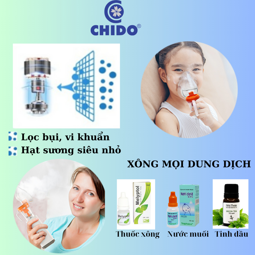 THÔNG TIN SẢN PHẨM: MÁY XÔNG MŨI HỌNG CẦM TAY CHIDO CÔNG NGHỆ NHẬT BẢN Máy xông mũi họng điện dung Chido là sản phẩm cao cấp sử dụng công nghệ điện dung Mesh Nebulizer tiên tiến của Nhật Bản. Giúp vệ sinh bảo vệ mũi họng hàng ngày trước sự ô nhiễm của môi trường. Hỗ trợ điều trị hiệu quả các bệnh về đường hô hấp: viêm mũi, viêm họng, viêm phế quản, hen suyễ Màng điện dung được xử lý chính xác khoảng 4.000 lỗ siêu nhỏ vận hàng cực êm, thoải mái cho cả các bạn nhỏ. Kích thước hạt sương mịn chỉ từ 2-4 µm giúp khuếch tán dung dịch vệ sinh sâu hơn, thẩm thấu hơn các loại máy xông thông thường. Nhỏ gọn, dễ dàng sử dụng chỉ với 1 nút bấm. Có 3 loại mặt nạ: mũi, họng và cho trẻ em Sử dụng cả pin và sạc USB cực kỳ linh hoạt khi di chuyển. ĐẶC ĐIỂM NỔI BẬT: