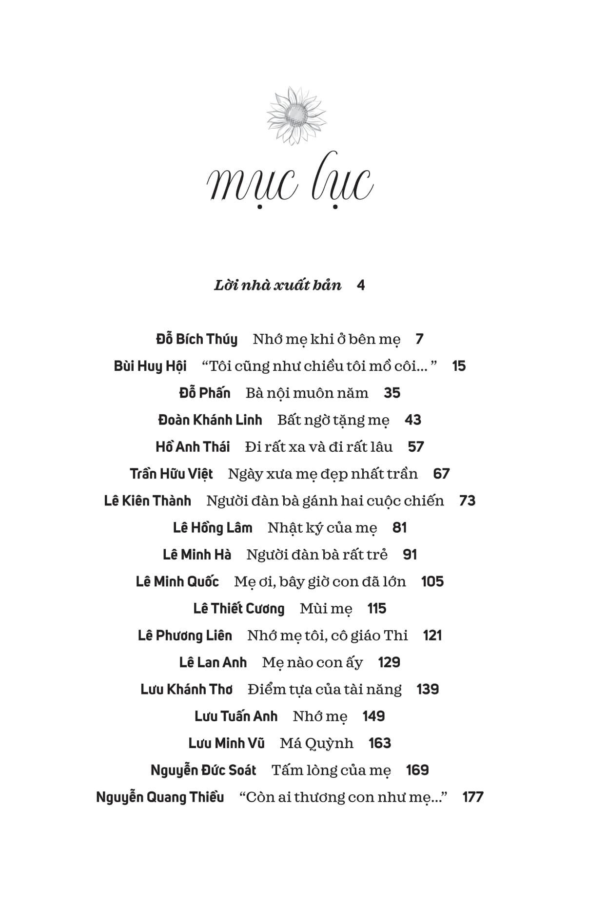 Mua tại TiktokCuốn sách tập hợp các bài viết chân thực, xúc động và hết sức độc đáo về tình cảm, kỷ niệm giữa mẹ con của những người nổi tiếng ở nhiều lĩnh vực khác nhau trong xã hội.
