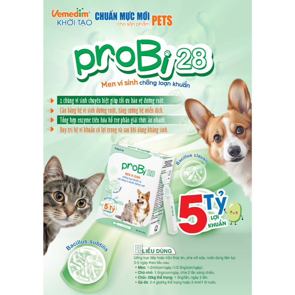 Vemedim Probi 28 Men Vi Sinh với 5 tỷ Lợi Khuẩn Vượt Trội, Bảo Vệ Đường Ruột cho Chó Mèo THÀNH PHẦN: Bacillus spp* (min) 10mũ12 CFU Kháng sinh, hormon không có Dung môi (nước tinh