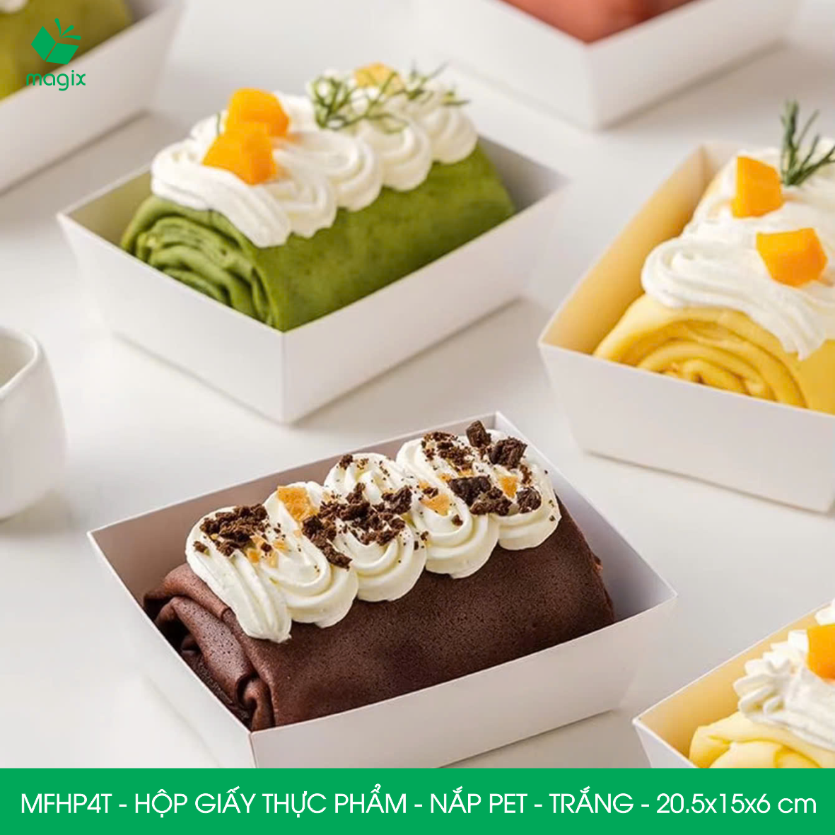 QUY CÁCH KỸ THUẬT Mã sản phẩm - Kích thước: • MFHP1N - Hộp giấy Kraft thực phẩm nắp Pet - Nâu - 10.5x10.5x6 cm • MFHP1T - Hộp giấy thực phẩm nắp Pet - Trắng - 10.5x10.5x6 cm • MFHP2N - Hộp giấy Kraft thực phẩm nắp Pet - Nâu - 15.5x8.5x6 cm • MFHP2T - Hộp giấy thực phẩm nắp Pet - Trắng - 15.5x8.5x6 cm • MFHP3N - Hộp giấy Kraft thực phẩm nắp Pet - Nâu - 20x12.5x6 cm • MFHP3T - Hộp giấy thực phẩm nắp Pet - Trắng - 20x12.5x6 cm • MFHP4N - Hộp giấy Kraft thực phẩm nắp Pet - Nâu - 20.5x15x6 cm • MFHP4T - Hộp giấy thực phẩm nắp Pet - Trắng - 20.5x15x6 cm • MFHP5N - Hộp giấy Kraft thực phẩm nắp Pet - Nâu - 12x12x6.5 cm • MFHP5T - Hộp giấy thực phẩm nắp Pet - Trắng - 12x12x6.5 cm • MFHP6N - Hộp giấy Kraft thực phẩm nắp Pet - Nâu - 14.5x13x6 cm • MFHP6T - Hộp giấy thực phẩm nắp Pet - Trắng - 14.5x13x6 cm • MFHP7N - Hộp giấy Kraft thực phẩm nắp Pet - Nâu - 19.5x9x6 cm • MFHP7T - Hộp giấy thực phẩm nắp Pet - Trắng - 19.5x9x6 cm