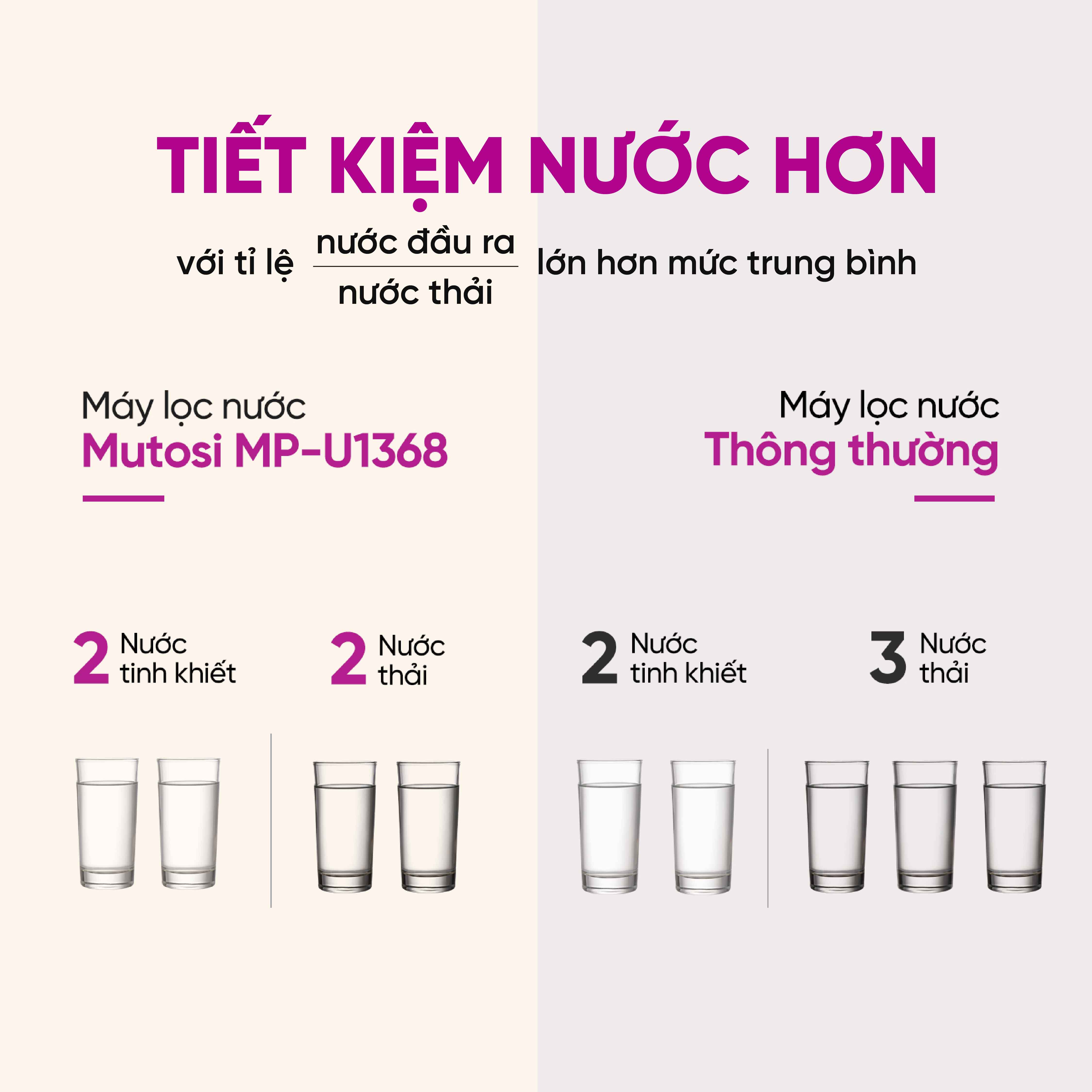 Tiết kiệm nước hơn nhờ tỉ lệ nước đầu ra/nước thải là 5 - 5 (tối ưu hơn mức tỷ lệ lọc/thải 4/6 của các dòng máy cùng phân khúc trên thị trường)