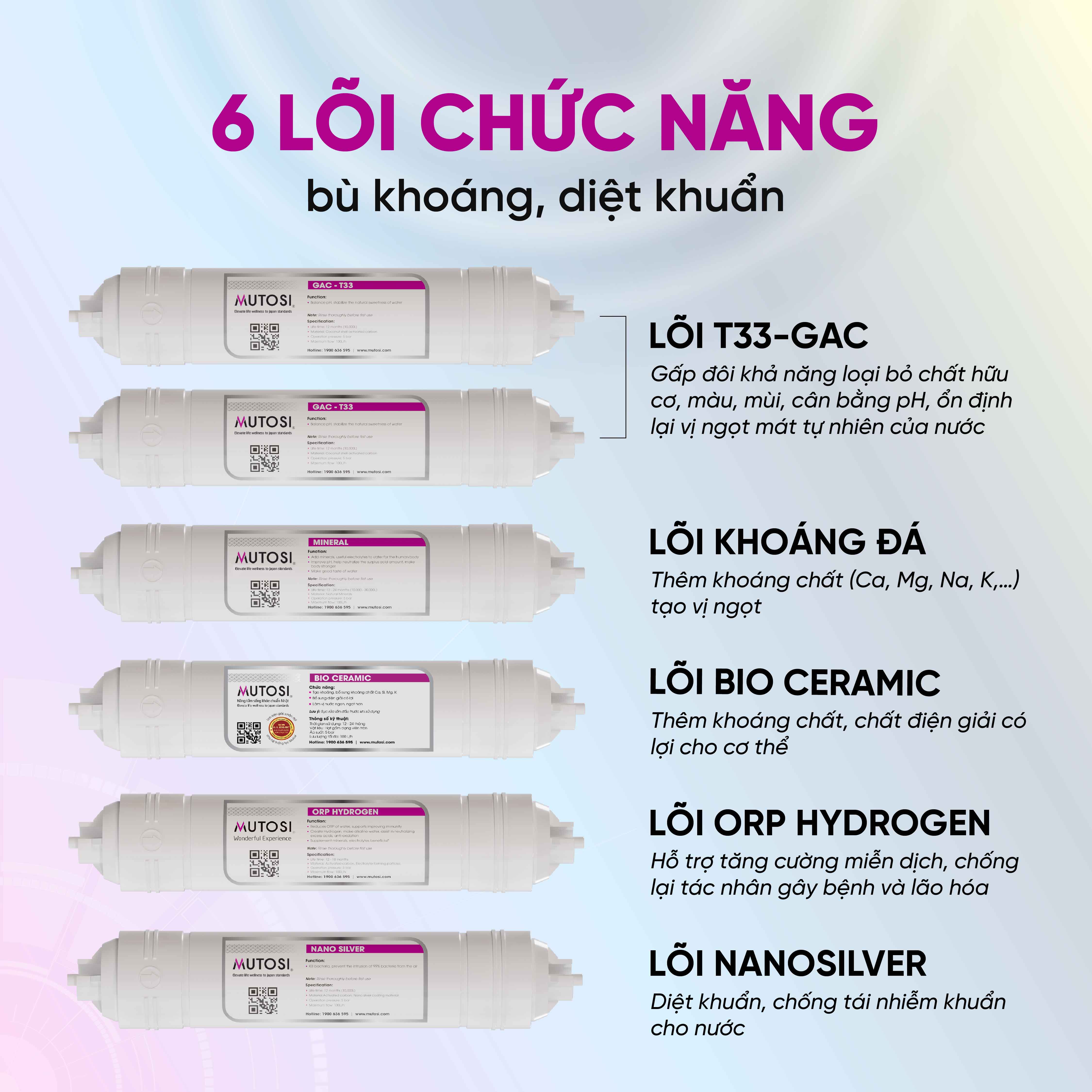 -6 lõi chức năng bao gồm: 2 lõi T33-GAC lõi Nano bạc, Lõi ORP Hydrogen, kết hợp cùng Lõi Bio Ceramic & Lõi khoáng đá, làm tăng hiệu quả khử mùi, diệt khuẩn, tăng thêm vị ngọt, bổ sung khoáng chất và điện giải có lợi cho sức khỏe.