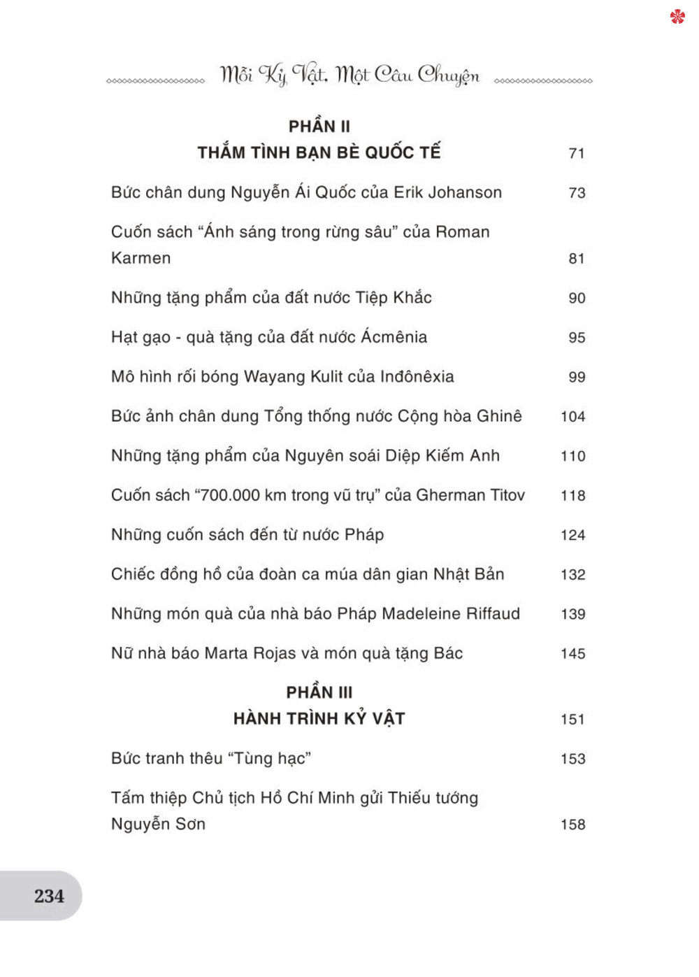 Các kỷ vật trong cuốn sách được sắp xếp theo trình tự thời gian tặng với ba phần nội dung chính: Phần I: Việt Nam nhớ mãi ơn Người Phần II: Thắm tình bạn bè quốc tế Phần III: Hành trình kỷ vật