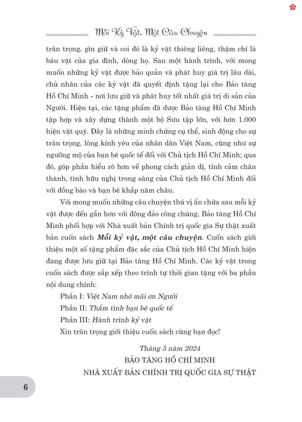 Mua tại TiktokVới mong muốn những câu chuyện thú vị ẩn chứa sau mỗi kỷ vật được đến gần hơn với đông đảo công chúng, Bảo tàng Hồ Chí Minh phối hợp với Nhà xuất bản Chính trị quốc gia Sự thật xuất bản cuốn sách Mỗi kỷ vật, một câu chuyện. Cuốn sách giới thiệu một số tặng phẩm đặc sắc của Chủ tịch Hồ Chí Minh hiện đang được lưu giữ tại Bảo tàng Hồ Chí Minh.