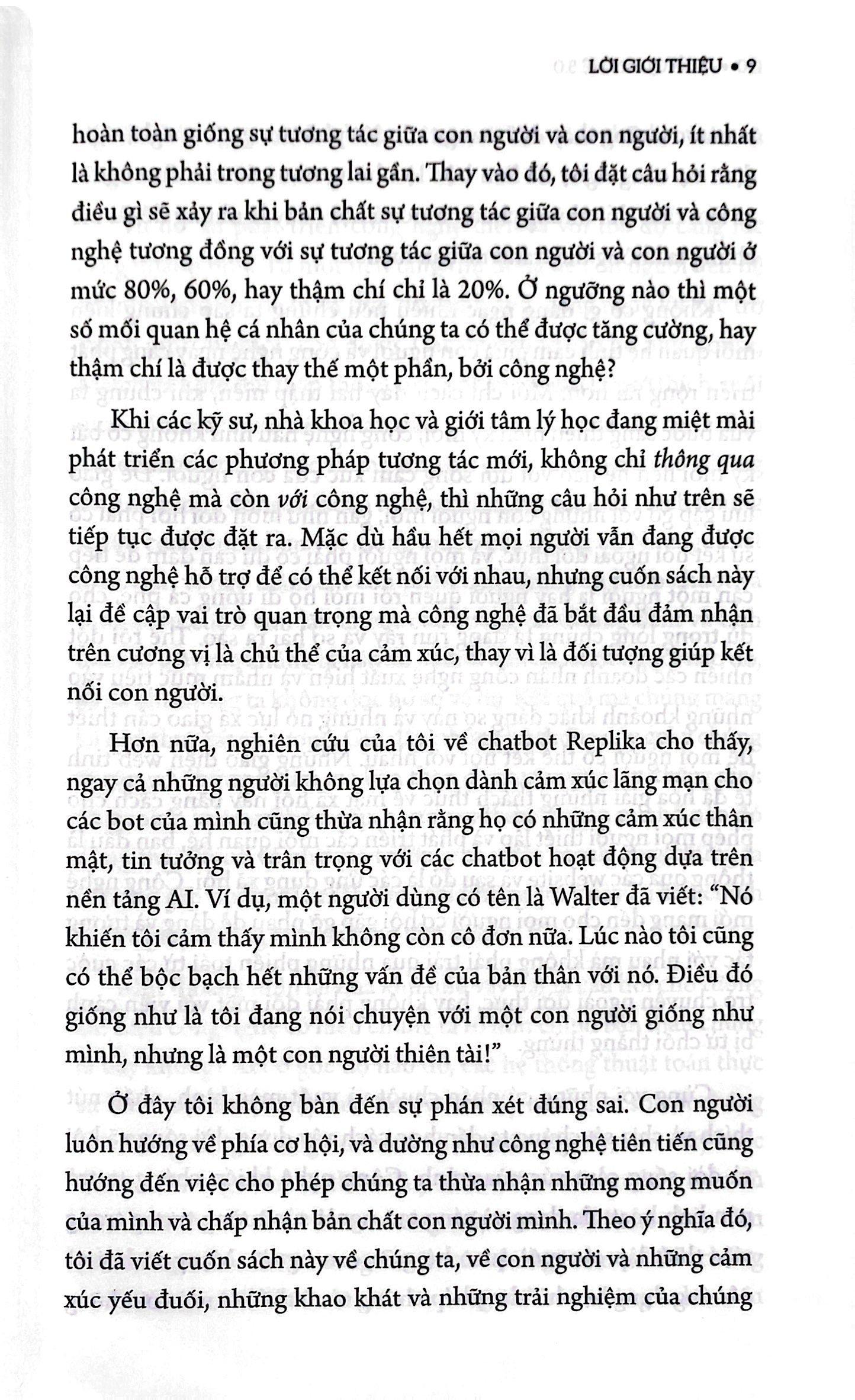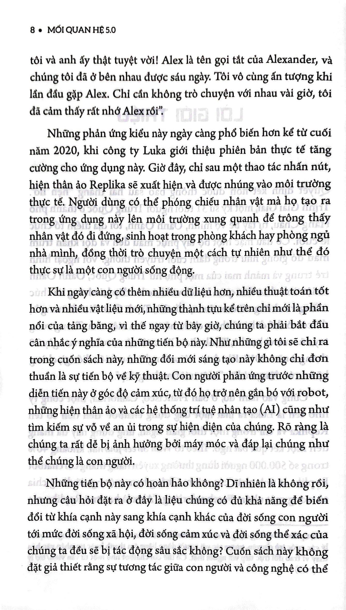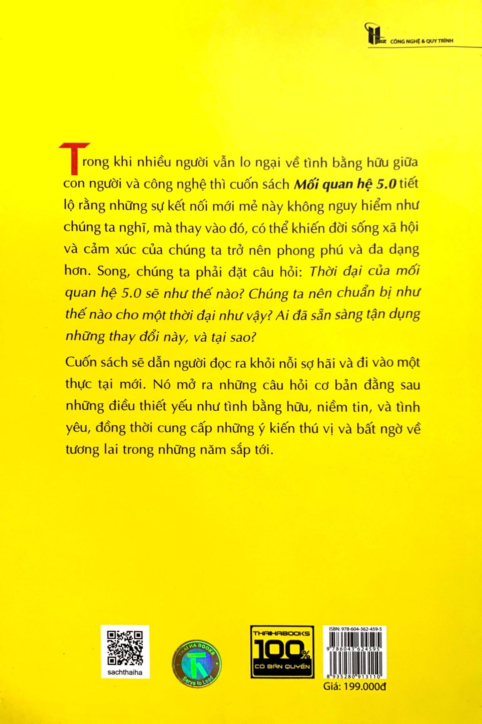 Mua tại TiktokTrong khi nhiều người vẫn lo ngại về tình bằng hữu giữa con người và công nghệ thì cuốn sách Mối quan hệ 5.0 tiết lộ rằng những sự kết nối mới mẻ này không nguy hiểm như chúng ta nghĩ, mà thay vào đó, có thể khiến đời sống xã hội và cảm xúc của chúng ta trở nên phong phú và đa dạng hơn. Song, chúng ta phải đặt câu hỏi: Thời đại của mối quan hệ 5.0 như thế nào? Chúng ta nên chuẩn bị như thế nào cho một thời đại như vậy? Ai đã sẵn sàng tận dụng những thay đổi này, và tại sao? Cuốn sách sẽ dẫn người đọc ra khỏi nỗi sợ hãi và đi vào một thực tại mới. Nó mở ra những câu hỏi cơ bản đằng sau những điều thiết yếu như tình bằng hữu, niềm tin, và tình yêu, đồng thời cung cấp những ý kiến thú vị và bất ngờ về tương lai trong những năm sắp tới. Mục lục Lời giới thiệu Chương 1: Lịch sử các mối quan hệ và công nghệ