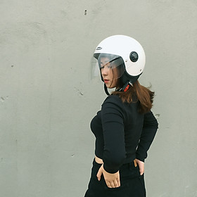 - Phong cách thiết kế: mũ kiểu 3/4 kèm kính dài, mũ được thiết kế dáng tròn, đi kèm 2 miếng ốp má, giúp tăng thêm hiệu quả bao phủ, bảo vệ khuôn mặt. -