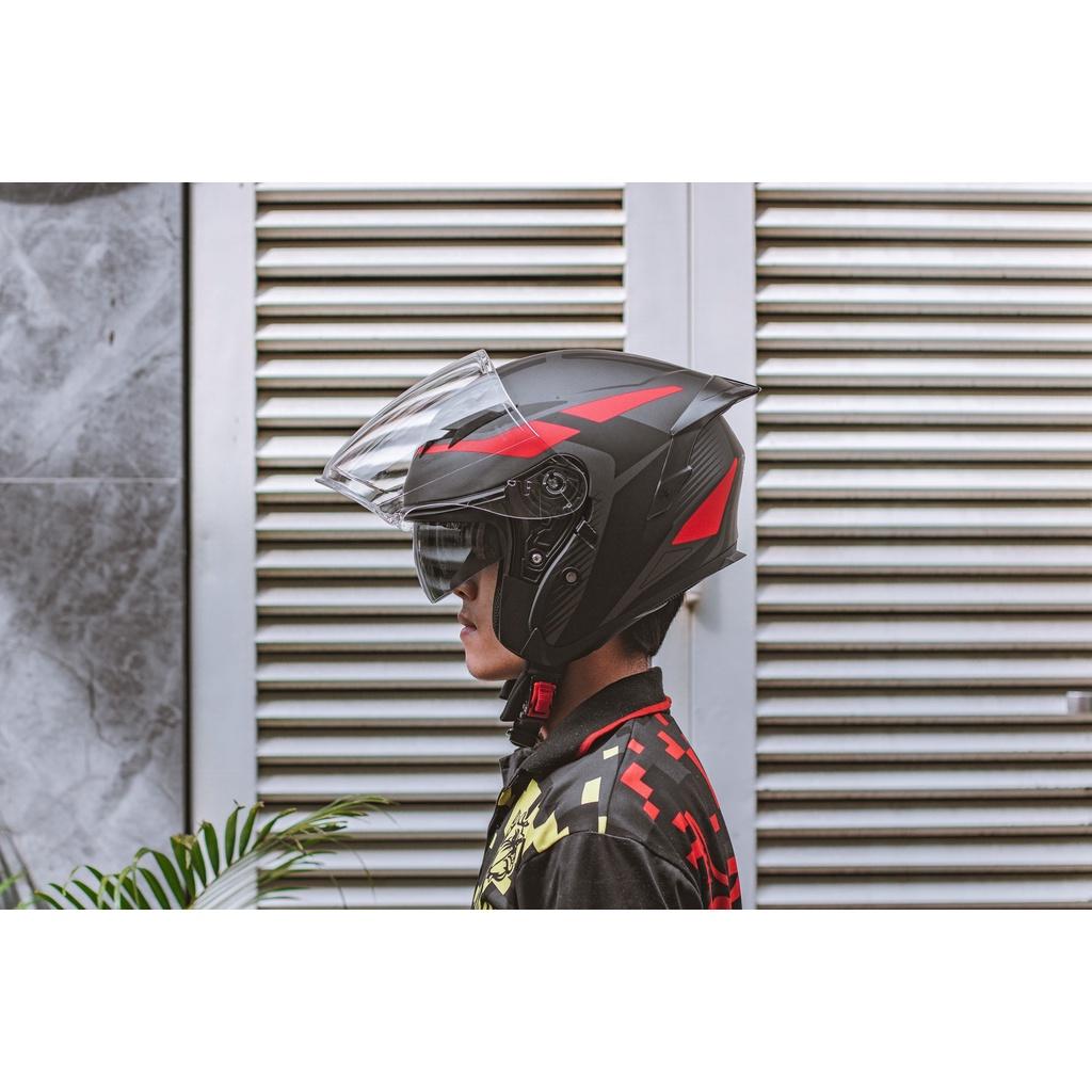 THIẾT KẾ THÔNG MINH - Phong cách thiết kế: mũ kiểu 3/4 kèm kính dài, mũ được thiết kế dáng tròn, đi kèm 2 miếng ốp má, giúp tăng thêm hiệu quả bao phủ, bảo