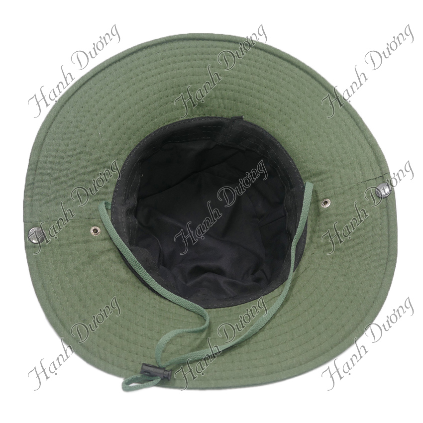 Vải Kaki dày dặn nhưng không nóng vì là 100%cotton. Có dây đeo không lo gió bay. Nút bấm kim loại 2 bên vành nón để bẻ lên cho ngầu luôn. Shop nhận thêu logo