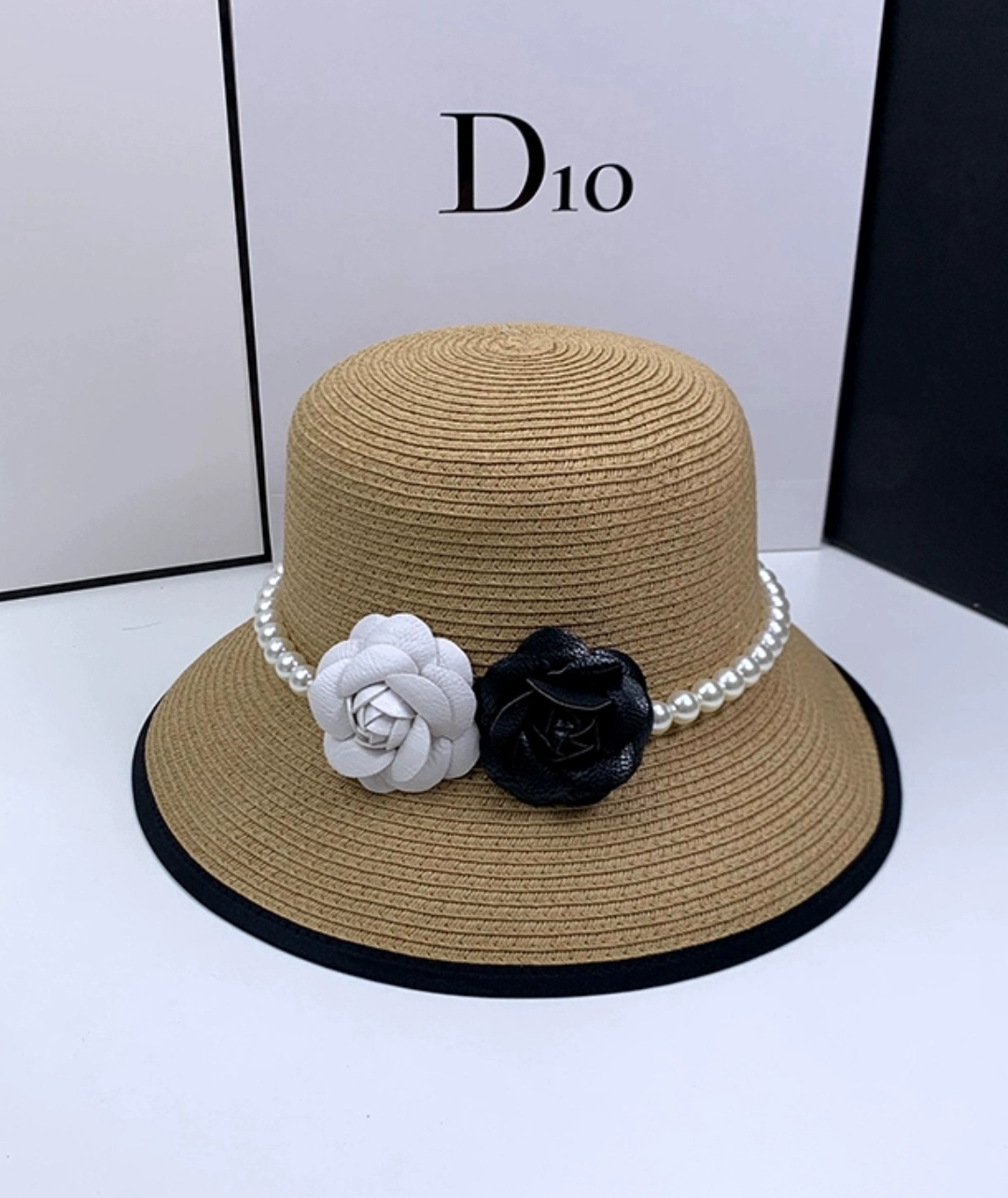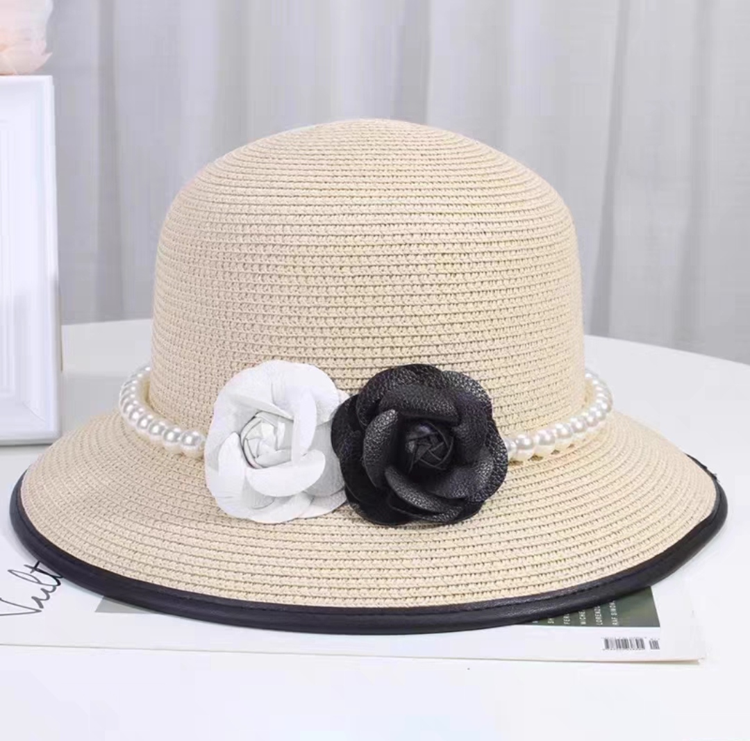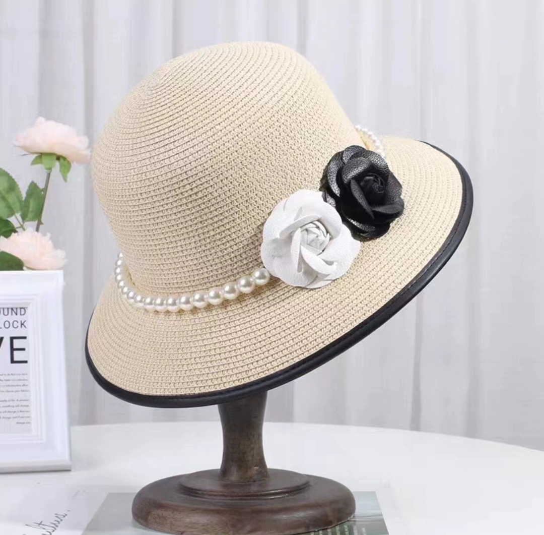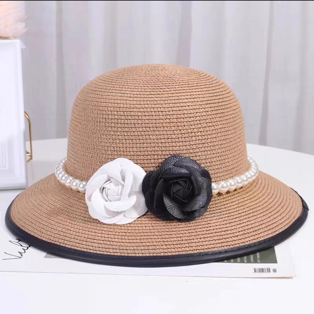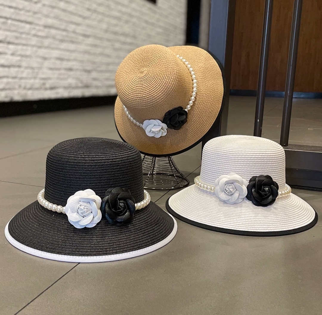 Nón đi biển mũ rộng vành chống nắng viền sọc phối đai ngọc trai nhân tạo 2 hoa trắng đen thời trang Hàn Quốc Chất liệu cói Kiểu dáng vành rộng Nón đi biển mũ