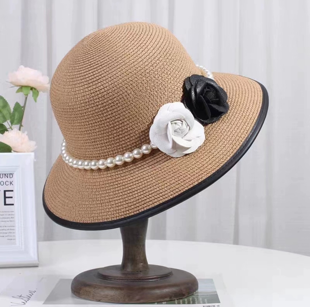 Mũ nón đi biển vành nhỏ chóp bằng phối đai trắng ngọc trai nhân tạo chất liệu cói chống nắng thoáng mát thời trang Hàn Quốc Chất liệu cói Kiểu dáng thời trang chống nắng