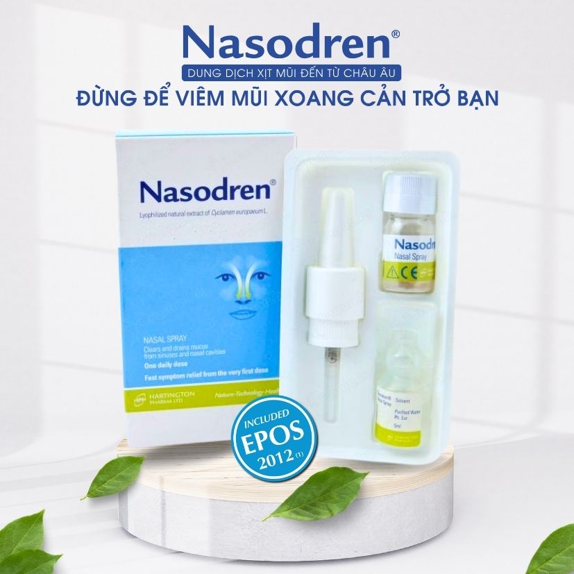 - Nasodren là một loại dung dịch xịt mũi dùng để giúp đưa gỉ và chất nhầy ra ngoài, đồng thời làm sạch mũi và xoang. Sử dụng để giảm các triệu chứng của viêm xoang cấp tính và viêm xoang mãn tính.