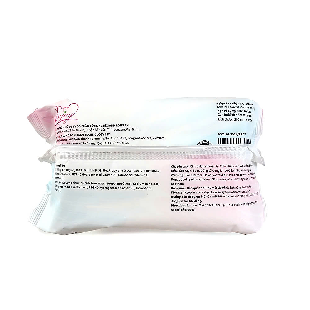 - Thành phần chính: Vải không dệt Rayon, Nước tinh khiết, Propylene Glycol, Sodium Benzoate, chiết xuất lô hội, PEG-40 Hydrogenated Castor Oil, Citric Acid, Vitamin E