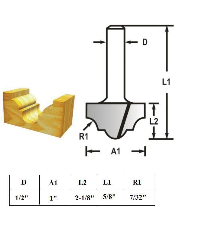 Mua tại TiktokMũi phay tạo rãnh. Dùng cho gỗ. Chất liệu: hợp kim thép Đường kính chui: 1/2" Đường kính mũi: 1" Tổng chiều dài: 2-1/8" Độ dài làm việc: 5/8" Độ cong: 7/32"
