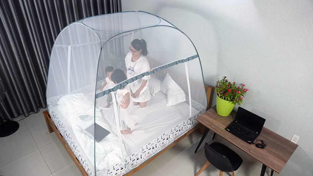 Kiểu dáng: Đỉnh rộng, có 2 cửa ra vào, có viền chân là từ vải nylon thay vì lưới mùng ( giúp bảo vệ 100% khi để tay chân chạm sát mùng)