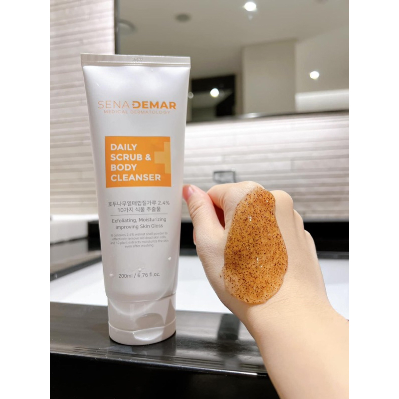 Sữa tắm tẩy tế bào chết body SENADEMAR 200ml trắng da,sáng mịn.   ️THÔNG TIN SẢN PHẨM ️ Thương hiệu: SENADEMAR ️ Xuất Xứ: Hàn Quốc ️ Dung Tích: 200ml ️ Hạn Sử Dụng: 24 Tháng ️ THÀNH PHẦN: ️ 24000ppm Bột Vỏ Hạt Óc Chó ️ Sáng Chế Derma-clera ️ 8 Loại Hyaluronic ️ Các Thành Phần Chiết Xuất Tự Nhiên   ️CÔNG DỤNG SẢN PHẨM: ️ Sản phẩm giúp loại bỏ lớp sừng da chết và bã nhờn, làm thông thoáng lỗ chân lông. ️ Cấp ẩm, giảm viêm da, bật tone nhẹ nhàng và làm mịn da ngay lần đầu tiên sử dụng.   ️ HƯỚNG DẪN SỬ DỤNG: ️ Làm ướt cơ thể với nước ấm. ️ Thoa một lượng vừa đủ lên da hoặc sử dụng bông tắm để tạo bọt. ️ Nhẹ nhàng massage body với hạt óc chó. ️ Rửa sạch lại bằng nước ấm.   ️BẢO QUẢN: ️ Bảo quản nơi khô ráo thoáng mát, tránh ánh nắng trực tiếp của mặt trời.