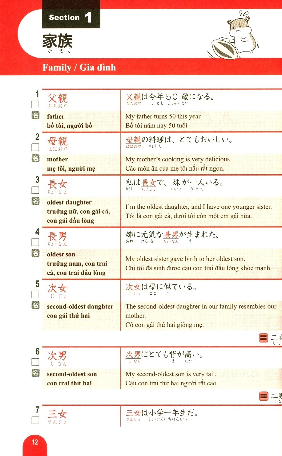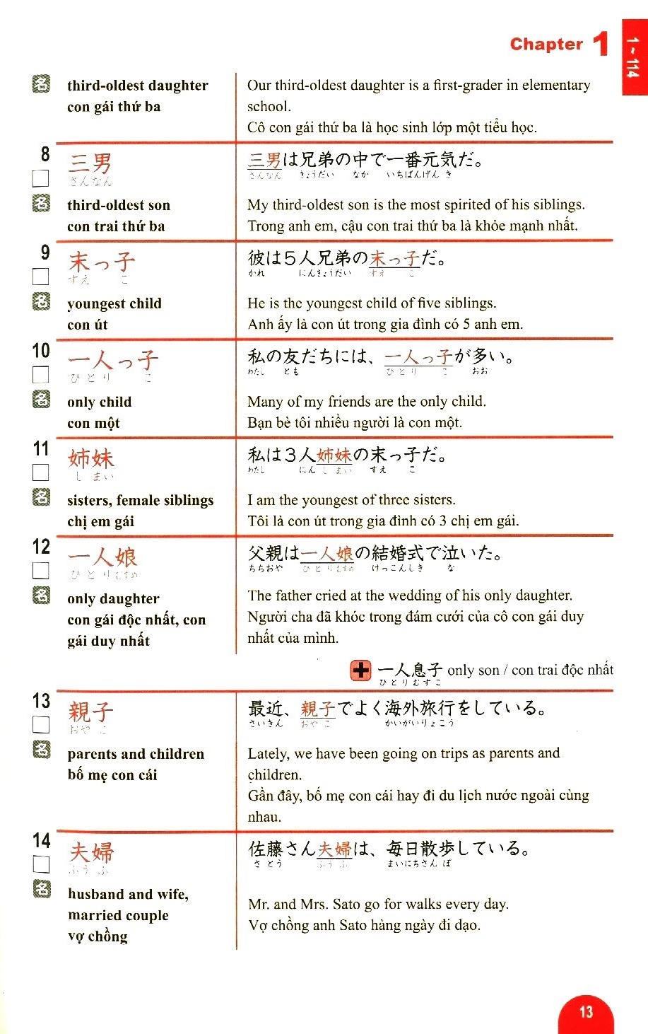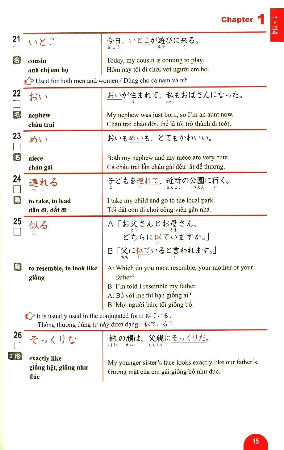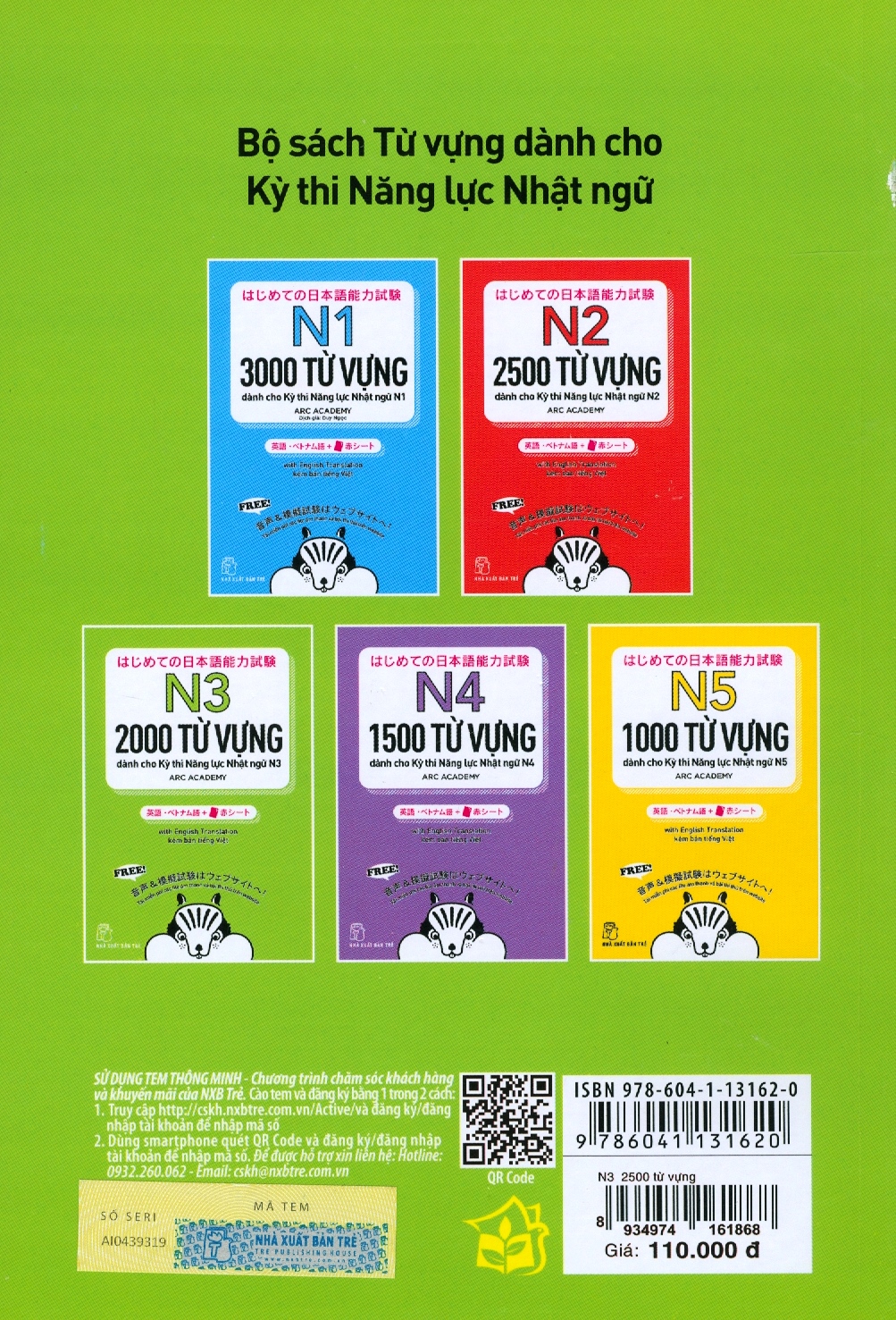 Bộ sách học từ vựng cấp độ N5 ~ N1 dành cho Kỳ thi Năng lực Nhật ngữ. Bộ sách gồm 5 cuốn: N1, N2, N3, N4, N5, tập hợp các từ vựng xuất hiện thường xuyên trong các kỳ thi Năng lực Nhật ngữ. Các từ vựng này được chia theo từng chủ đề, đi kèm các câu ví dụ. Đặc biệt bộ sách có kèm theo bản dịch Anh - Trung - Việt, rất tiện cho các bạn tự học ở nhà.