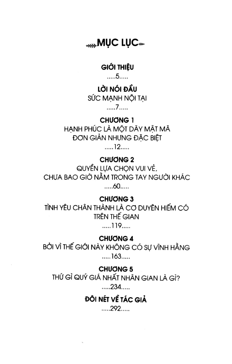 Với hơn 80 câu chuyện với 5 chương chính: Hạnh phúc là một dãy mật mã đơn giản nhưng đặc biệt; Quyền lựa chọn vui vẻ, chưa bao giờ nằm trong tay người khác; Tình yêu chân thành là cơ duyên hiếm có trên thế gian; Bởi thế giới này không có sự vĩnh hằng; Thứ quý giá nhất trên thế gian là gì?
