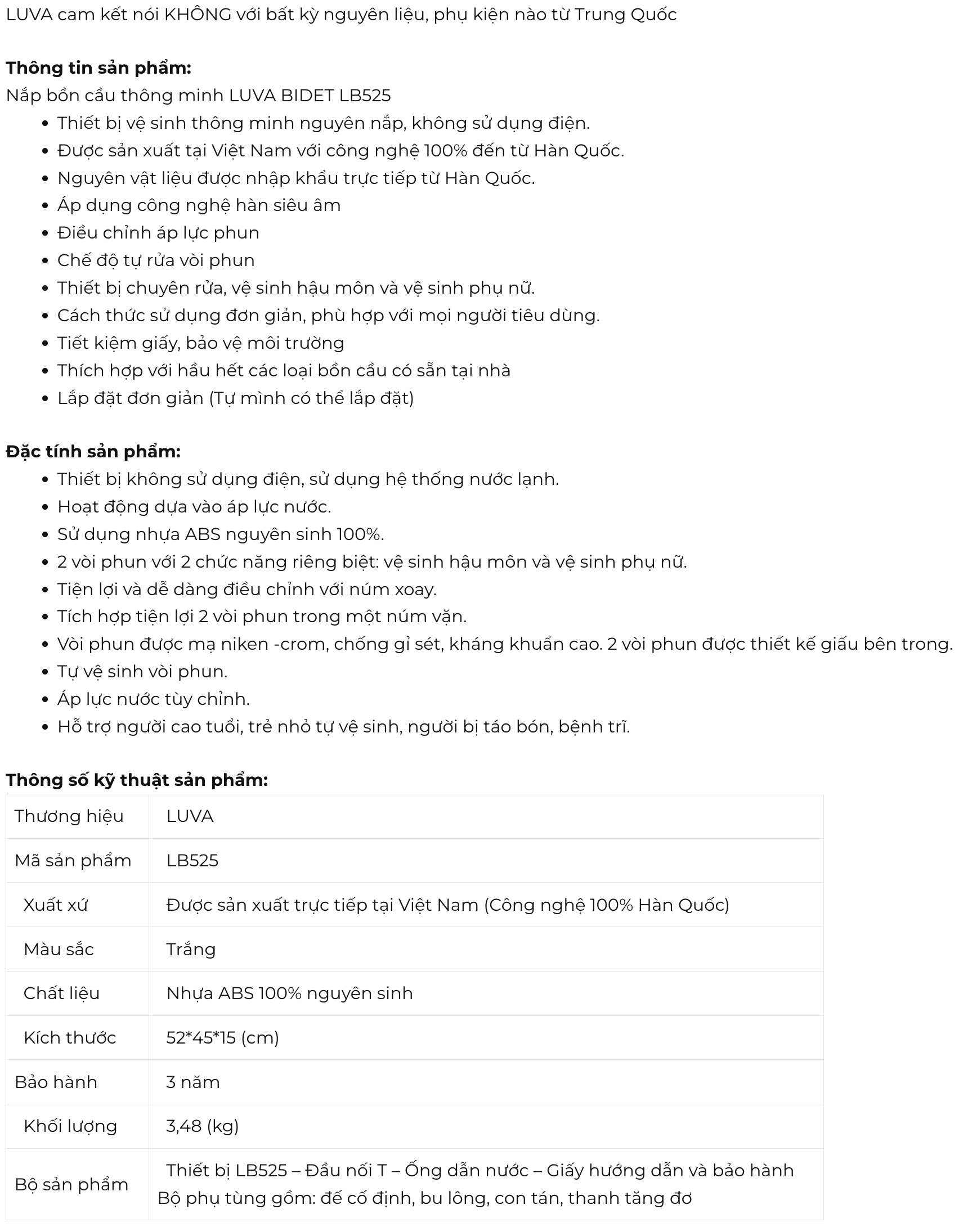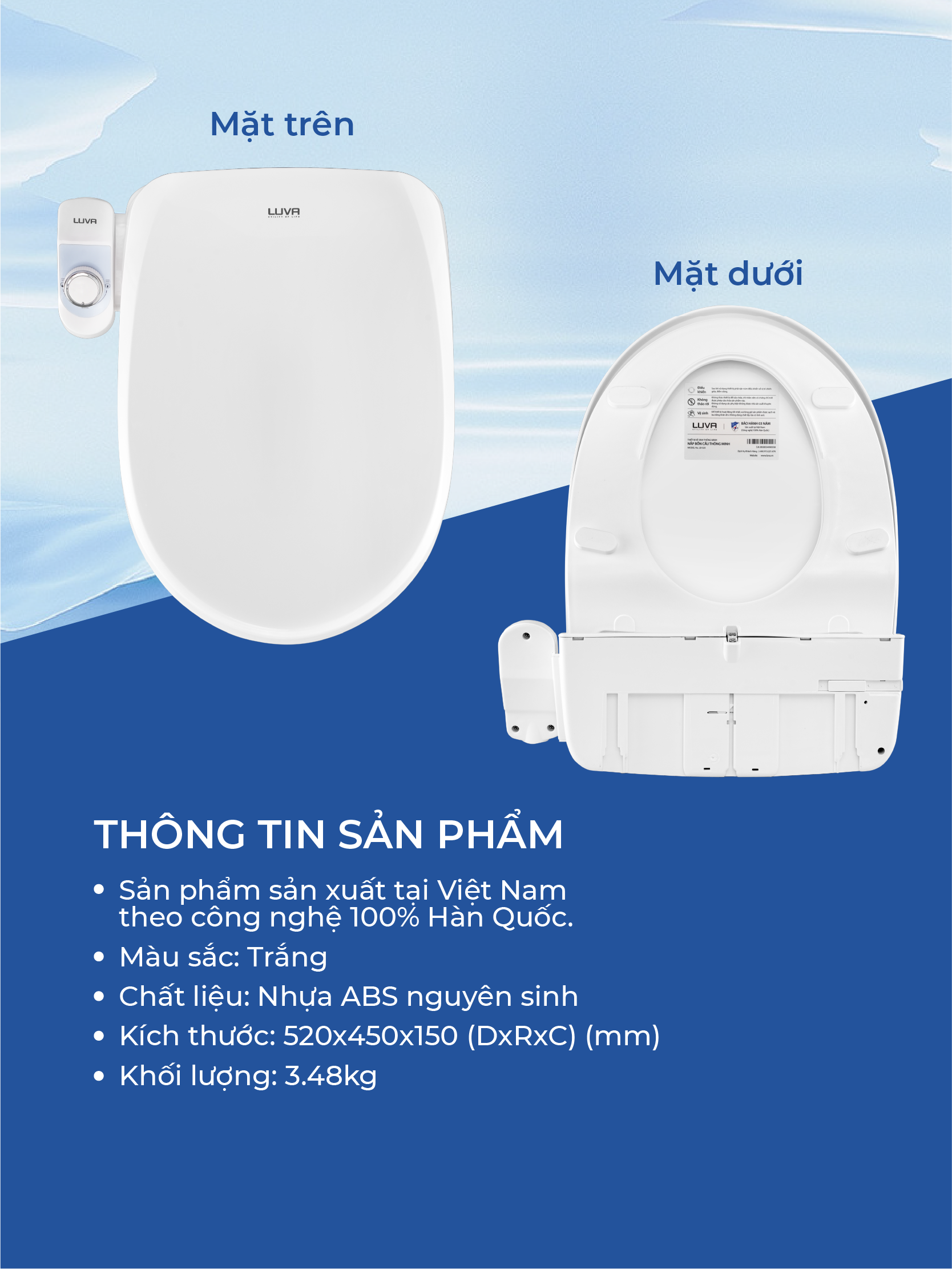 Nắp Bồn Cầu Thông Minh LUVA Bidet LB525 Xuất Hàn Quốc, Bảo Hành 3 năm, đổi lỗi 100 ngày, công nghệ hàn siêu âm LUVA cam kết nói KHÔNG với bất kỳ nguyên liệu,