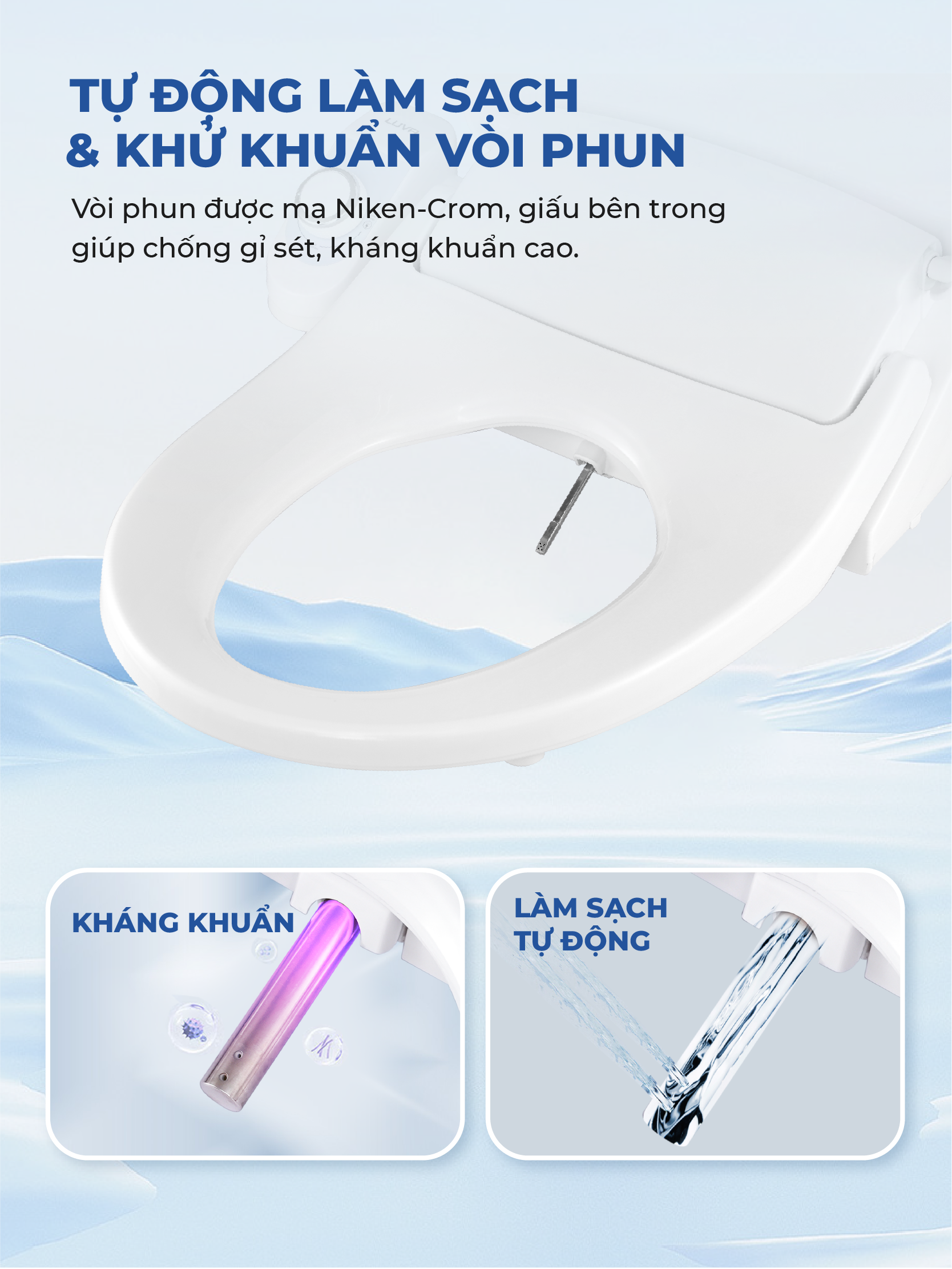 Sản phẩm có 2 vòi xịt, xịt rửa hậu môn và vệ sinh cho phụ nữ, sản phẩm không dùng điện. Mã BM01-V thay thế toàn bộ nắp bồn cầu cũ và vòi xịt ẩn