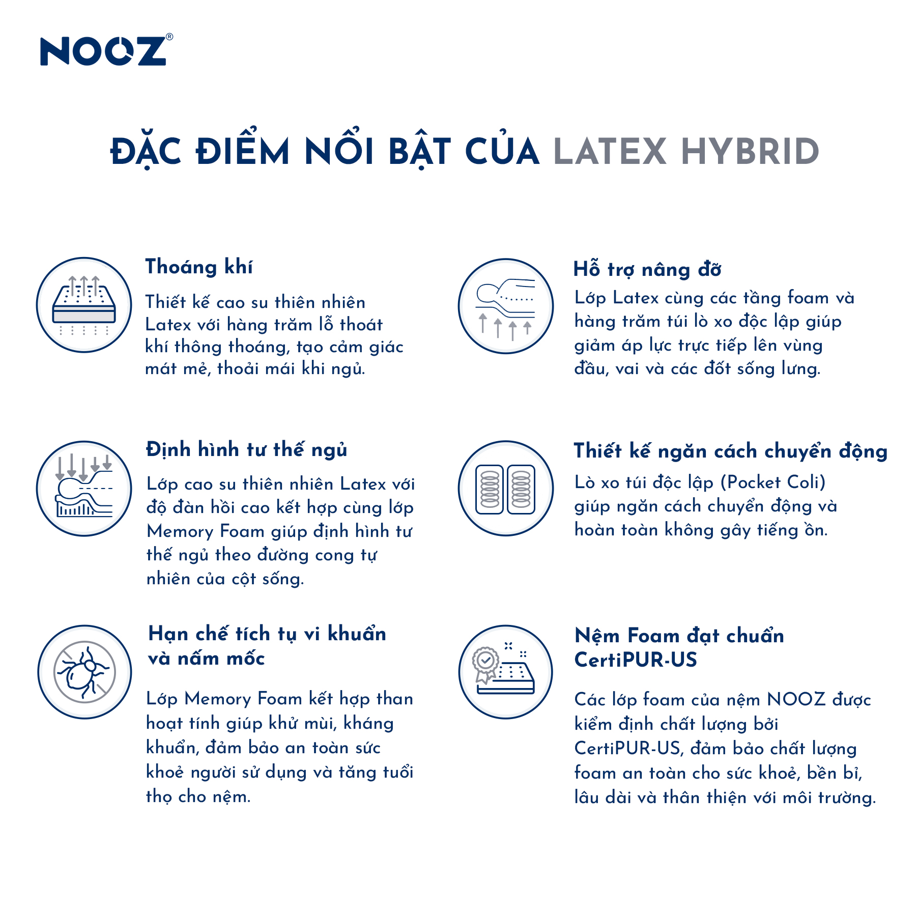 - Sản phẩm nệm Hybrid Latex bao gồm: Lớp vỏ bọc nệm với công nghệ làm mát Aircool, lớp cao su thiên nhiên Latex, lớp Memory Foam kết hợp Than Hoạt Tính, lớp Memory Foam Mật Độ Cao, lò xo túi độc lập, lớp PU Foam, lớp vải dệt kim 3D.