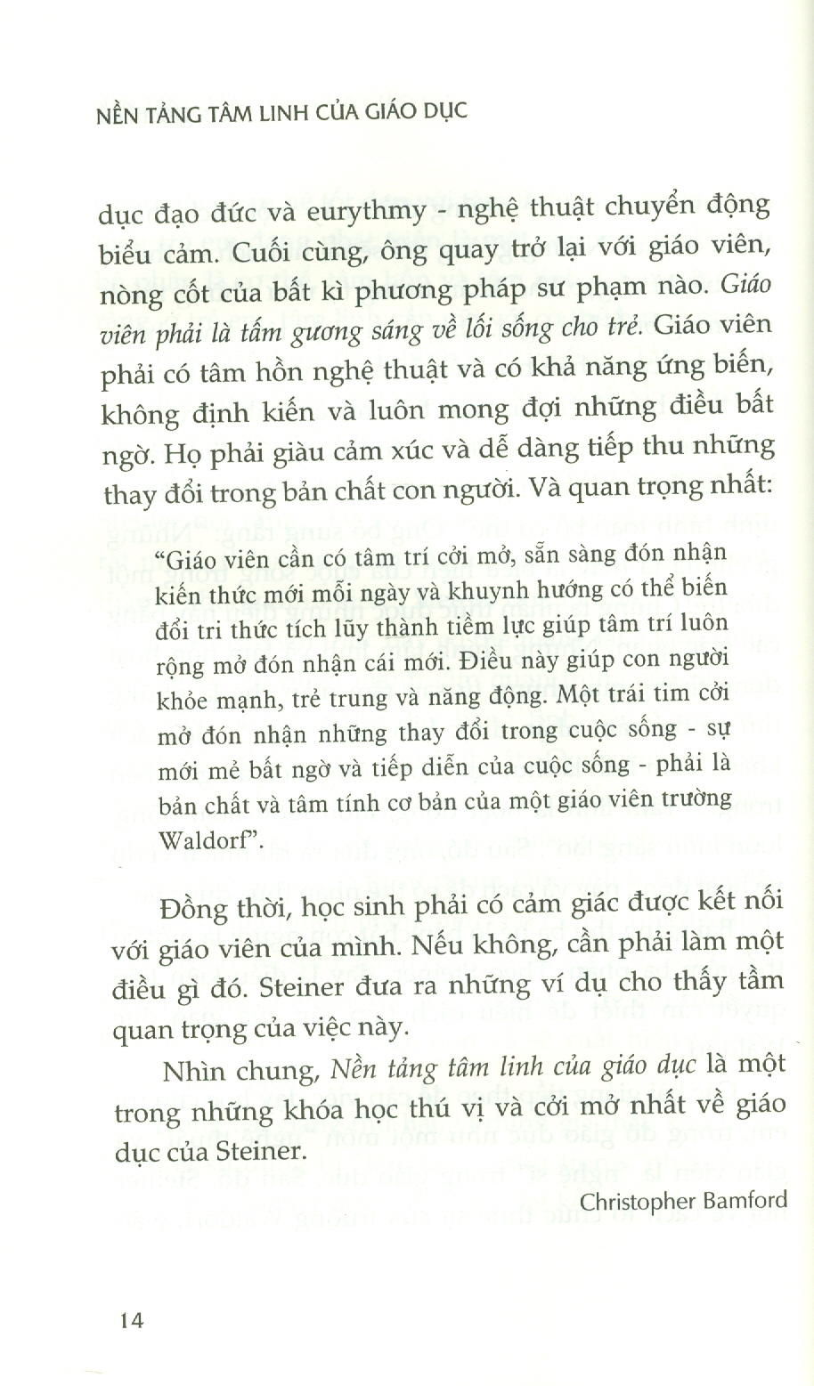 - Tác phẩm Nền tảng tâm linh của giáo dục là một trong những bài giảng xuất sắc của Rudolf Steiner về phương pháp giáo dục Waldorf vì có cái nhìn rộng rãi, sâu sắc, táo bạo và có khả năng tiếp cận cao. Bài giảng được đưa ra năm 1922 tại Đại học Mansfield, Oxford, Anh và thính giả là những người danh tiếng nhất mà Steiner từng thuyết giảng. Đó là hội nghị về “Giá trị tâm linh trong giáo dục và đời sống xã hội” với khoảng 200 người tham dự. Tiến sĩ Millicent Mackenzie, sau này là Giáo sư Giáo dục tại thành phố Cardiff (Wales) - người mà Steiner rất kính trọng - giữ vai trò chủ tọa trong các bài giảng. Bộ trưởng Bộ Lao động, Tiến sĩ H. A. L. Fisher chịu trách nhiệm điều khiển Hội nghị. Các diễn giả khác là những tên tuổi nổi tiếng như học giả cổ điển vĩ đại Gilbert Murray, nhà văn A. Clutton Brock, Giáo sư Maxwell Garnett và Edward Holmes. “Giáo viên cần có tâm trí cởi mở, sẵn sàng đón nhận kiến thức mới mỗi ngày và khuynh hướng có thể biến đổi tri thức tích lũy thành tiềm lực giúp tâm trí luôn rộng mở đón nhận cái mới. Điều này giúp con người khỏe mạnh, trẻ trung và năng động. Một trái tim cởi mở đón nhận những thay đổi trong cuộc sống - sự mới mẻ bất ngờ và tiếp diễn của cuộc sống - phải là bản chất và tâm tính cơ bản của một giáo viên trường Waldorf”.