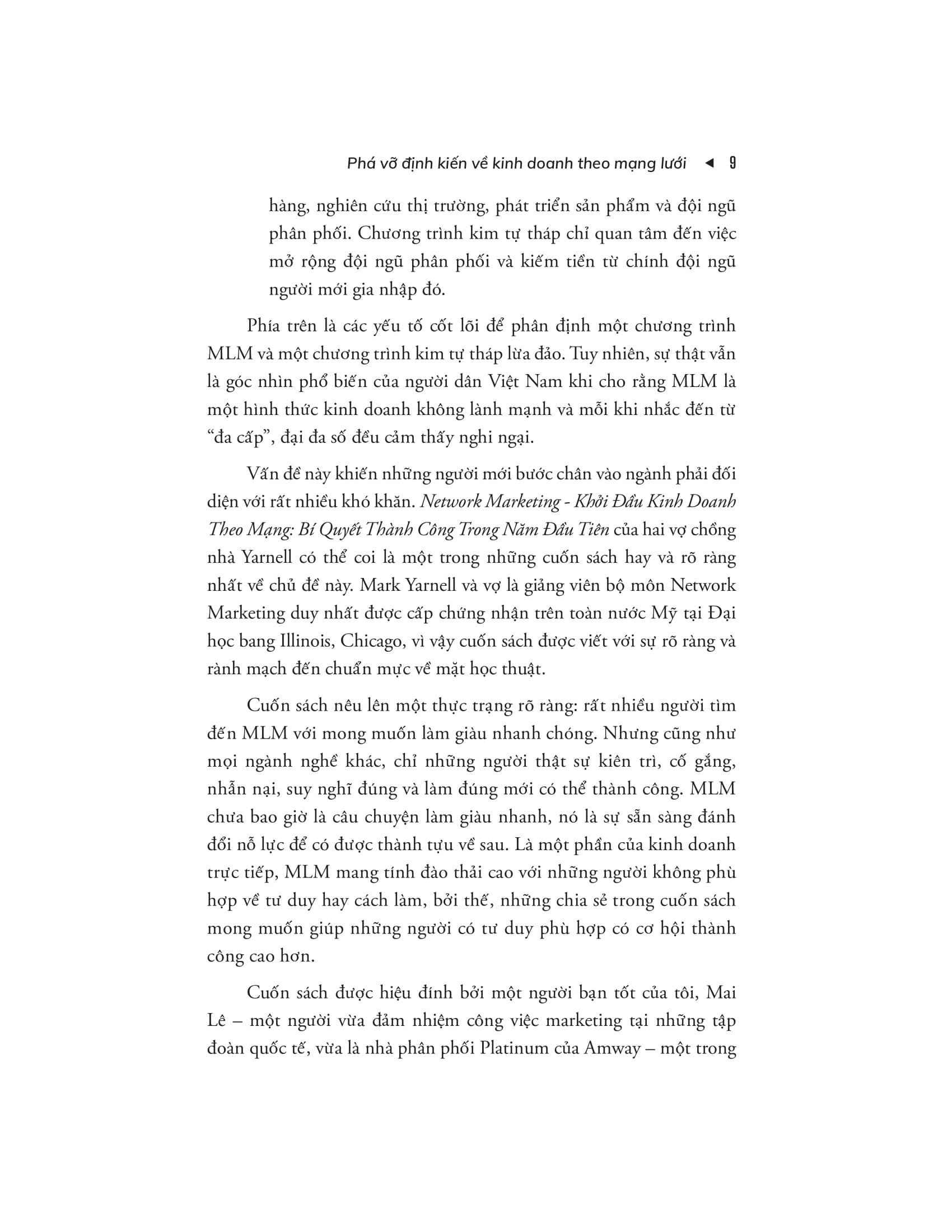 • Tập trung vào sự phát triển cá nhân: Bên cạnh các chiến lược kinh doanh, cuốn sách cũng nhấn mạnh tầm quan trọng của việc phát triển bản thân, tư duy tích cực và kiên trì, những yếu tố cần thiết để đạt được thành công lâu dài trong kinh doanh theo mạng.