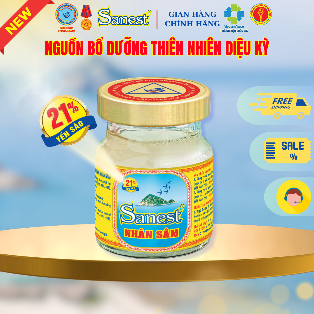 NƯỚC YẾN SÀO KHÁNH HÒA SANEST FUCOIDAN NHÂN SÂM – HÀM LƯỢNG YẾN BỔ SUNG 21% Nước Yến sào Khánh Hòa Sanest Fucoidan Nhân sâm được sản xuất từ nguồn Yến sào thiên nhiên do