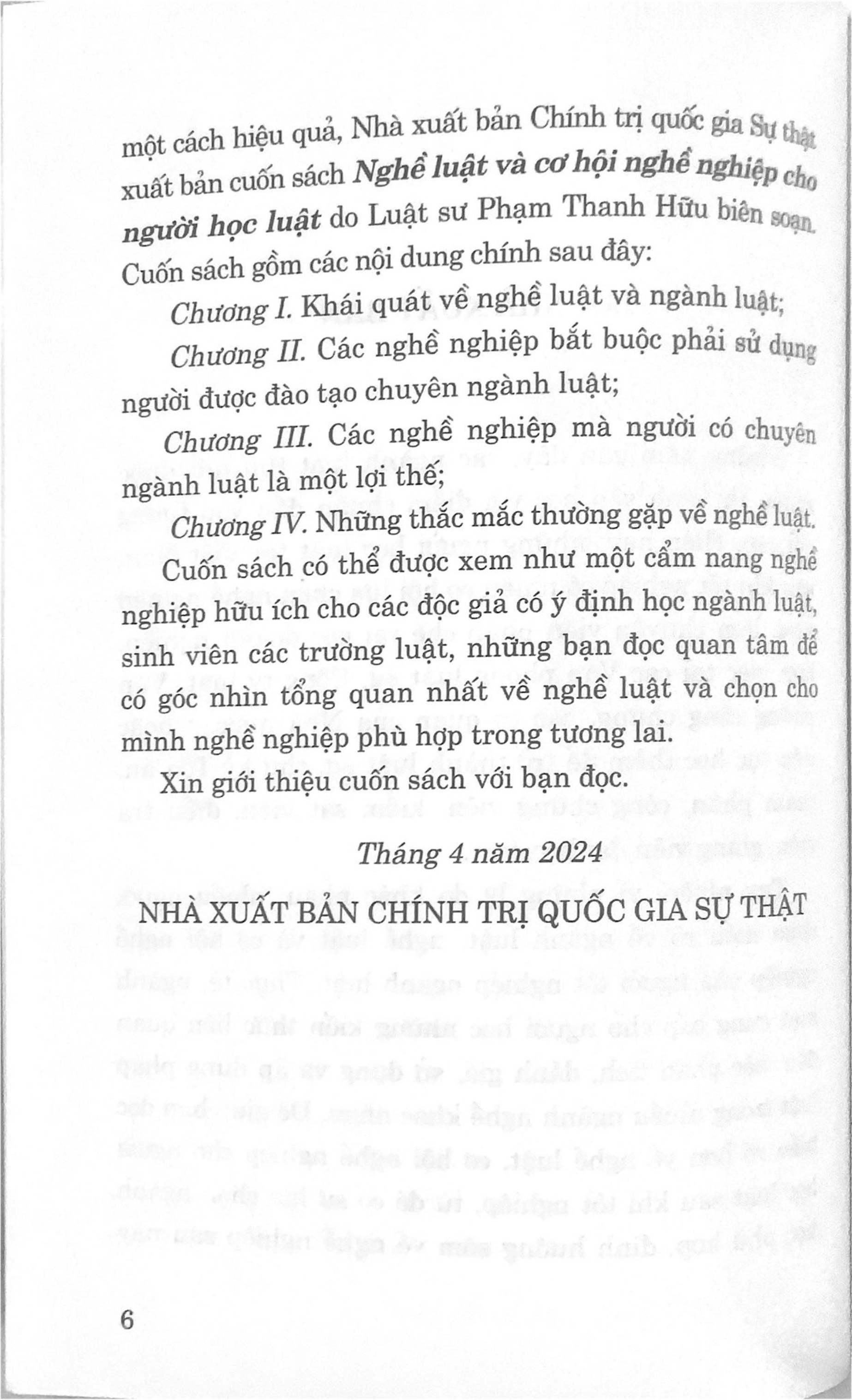 Nghề Luật và cơ hội nghề nghiệp cho người học luật Tác giả: Luật sư Phạm Thanh Hữu Nhà xuất bản: Chính Trị Quốc Gia Sự Thật Khổ sách: 14.5*20.5cm Năm phát hành: 5.2024 Công