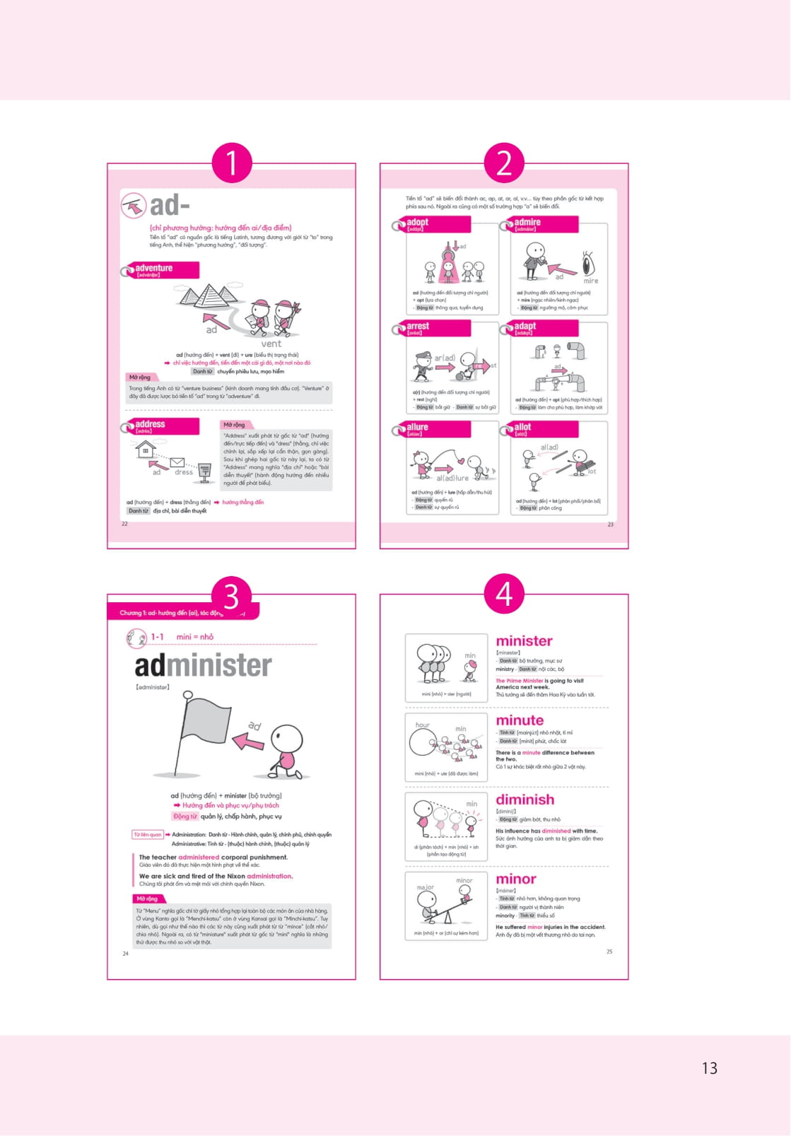 Trang thứ 3 đưa ra 1 từ vựng và giải thích gốc từ của nó. Ví dụ: “administer” có chứa tiền tố “ad” và gốc “mini”.