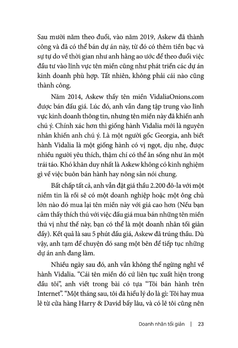 Thế nên với họ, một doanh nghiệp thu về lợi nhuận và phát triển ổn định không được coi là một doanh nghiệp thành công. Qua trải nghiệm của tác giả Sahil Lavingia ở cả Thung lũng Silicon lẫn ở những khu vực ít ồn ào hơn, tác giả đã có cái nhìn ở cả hai môi trường và từ đó đặt ra khái niệm "doanh nhân tối giản".
