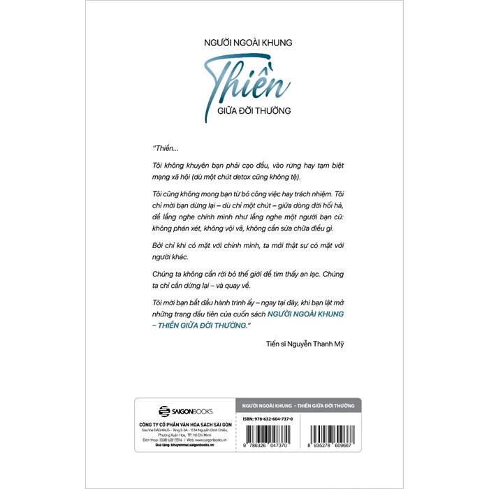 Người Ngoài Khung - Thiền Giữa Đời Thường Ở Việt Nam, khi nhắc đến thiền, nhiều người dễ liên tưởng đến các hoạt động mang tính tôn giáo. Phần lớn sách viết về thiền cũng do các bậc tu hành biên soạn, khiến công chúng khó thấy sự gần gũi vì khoảng cách giữa tác giả và người đọc vẫn còn khá xa. Từ góc nhìn của một nhà khoa học, một “doanh nông” giản dị, một người khởi nghiệp ở tuổi 60 và chọn gắn bó phần đời còn lại với nông dân quê hương, tác giả Nguyễn Thanh Mỹ sẽ cho người đọc hiểu thế nào là “thiền giữa đời thường” và “sống thiền” thực sự ra sao. Quyển sách mang đến cách tiếp cận gần gũi, lồng ghép giữa dữ liệu khoa học, chuyện đời và trải nghiệm lãnh đạo doanh nghiệp một cách chân thực, mộc mạc. Bạn đọc sẽ được lắng nghe lời tâm sự từ một người bạn vong niên giàu trải nghiệm và đầy tình thương. Thiền, không chỉ là ngồi yên và quan sát tâm trí, mà còn là khả năng “hành thiền” trong từng hành động đời thường. Một kỹ năng sống thiết yếu giữa nhịp sống hiện đại đầy biến động và bận rộn như hôm nay. CUỐN SÁCH CHỨNG MINH THIỀN LÀ MỘT LỐI SỐNG: THỰC TIỄN, SÂU SẮC VÀ DÀNH CHO TẤT CẢ MỌI NGƯỜI Thông tin tác giả Tiến sĩ Nguyễn Thanh Mỹ là Chủ tịch Hội đồng quản trị Công ty Cổ phần MyLan Group; Chủ tịch Hội đồng quản trị Công ty Cổ phần RYNAN Holdings JSC, có trụ sở tại Khu công nghiệp Long Đức, TP. Trà Vinh. Ông là một doanh nhân và nhà khoa học nổi tiếng người Việt Nam, là nhà phát minh và đồng phát minh trên 400 bằng sáng chế ở Hoa Kỳ, Canada, Trung Quốc, Việt Nam và nhiều nước khác. Ông cũng là đồng tác giả 68 bài báo cáo về hóa học vật liệu trên các tạp chí khoa học ở Hoa Kỳ, Anh và Đức. Ông đã nhiều lần tham gia các hội nghị về khoa học, khởi nghiệp, nông nghiệp thông minh trong và ngoài nước với tư cách diễn giả.