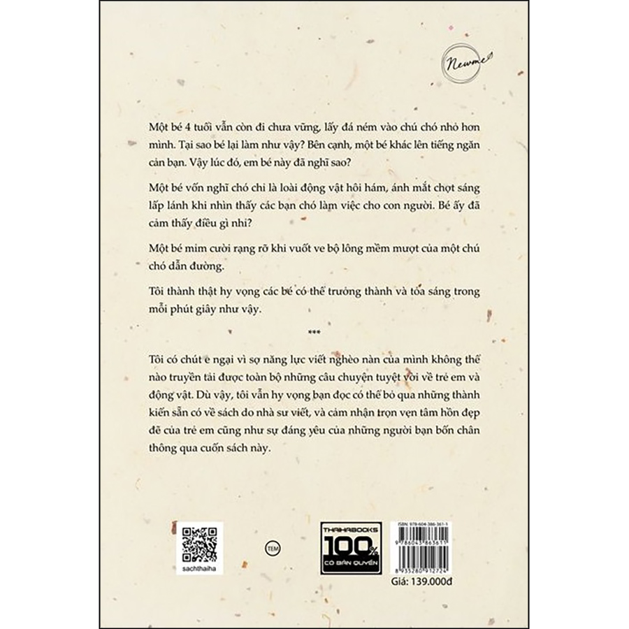 Nhà sư dọn phân chó Một bé bốn tuổi vẫn còn đi chưa vững, lấy đá ném vào chú chó bé nhỏ hơn mình. Tại sao bé lại làm như vậy? Bên cạnh, một bé khác lên tiếng ngăn cản bạn. Vậy lúc đó, em bé này đã nghĩ sao? Một bé vốn nghĩ chó chỉ là loài động vật hôi hám, ánh mắt chợt sáng lấp lánh khi nhìn thấy các bạn chó làm việc cho con người. Bé ấy đã cảm thấy điều gì nhỉ? Một bé mỉm cười rạng rỡ khi vuốt ve bộ lông mềm mượt của một chú chó dẫn đường. Tôi thành thật hy vọng các bé có thể trưởng thành và tỏa sáng trong mỗi phút giây như vậy. Đồng hành cùng tôi và các bé là ba chú chó trắng, chó dẫn đường, chó nghiệp vụ của trang trại sản xuất thực phẩm cho chó và cha mẹ, ông bà của các bé – những người đang hoan nghênh, cổ vũ các em cũng như nỗ lực của các cô giáo ở trường mầm non. Tôi có chút e ngại vì sợ năng lực viết nghèo nàn của mình không thể nào truyền tải được toàn bộ những câu chuyện tuyệt vời về trẻ em và động vật. Dù vậy, tôi vẫn hy vọng bạn đọc có thể bỏ qua những thành kiến sẵn có về sách do nhà sư viết, và cảm nhận trọn vẹn tâm hồn đẹp đẽ của trẻ em cũng như sự đáng yêu của những người bạn bốn chân thông qua cuốn sách này. Thông qua những câu chuyện thường ngày của một nhà sư cùng những người bạn đồng hành bốn chân và các em bé đáng yêu, tác giả bày tỏ cảm nhận của mình về cuộc sống. Trích đoạn sách hay: Giữa đám cỏ, một bông cúc đang lớn lên. Hoa cúc chỉ là hoa cúc nếu được ở cùng những bông cúc khác. Nếu mọc giữa bãi cỏ, thì nó cũng chỉ là cỏ dại mà thôi. Tuy nhiên, cỏ dại không đuổi hoa cúc đi vì chướng mắt, mà cả hai vẫn hòa thuận lớn lên cùng nhau. Ai cũng biết bồ công anh là loài hoa đẹp, nhưng nếu thận trọng ngắm nhìn, ngay cả những bông hoa dại không tên vẫn có nét đẹp riêng. Cả tôi và những bông hoa dại đều sống trên mặt đất này, chúng tôi có khác gì nhau đâu cơ chứ? Chúng tôi đều chỉ dạo chơi trên Trái đất một thoáng rồi lại đi. Khi nhìn thấy những bức ảnh các chú chó dễ thương đi loanh quanh trên mạng, tôi liền tự hỏi đây có phải là diễn không. Nhưng khi nhìn đàn con của Sunwoo, tôi biết rằng đó là sự thật. Chúng ta sống cùng nhiều thành kiến và định kiến. Dẫu biết những điều ấy sẽ làm khổ mình, nhưng chúng ta vẫn không sao thoát ra được. Đôi khi chứng kiến bản thân sống với định kiến như vậy cũng làm tôi không khỏi giật mình. Đức Phật dạy rằng, chúng ta đừng nên soi xét dáng vẻ cùng những gì người khác làm hay không làm được, mà nên tập trung vào những gì mình có thể và không thể làm. Những lúc bắt gặp mình để ý quá nhiều đến người khác, tôi thực lòng cảm thấy thật xấu hổ. Công ty Cổ phần Sách Thái Hà trân trọng giới thiệu!
