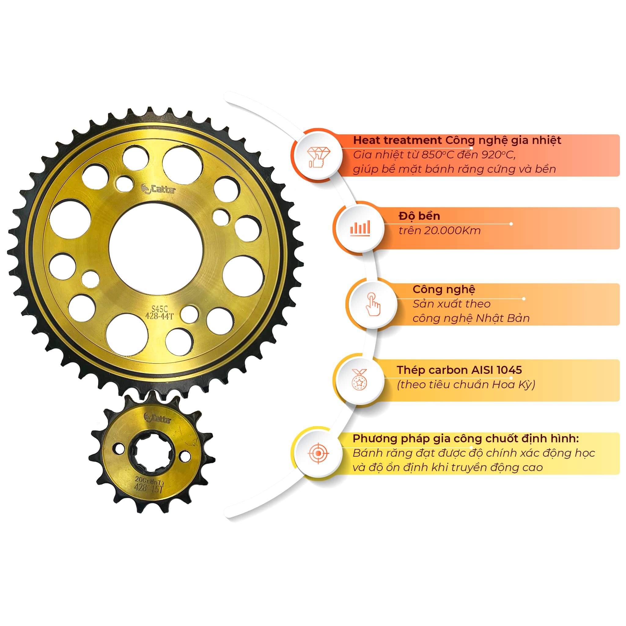 Nhông sên dĩa Winner (bộ nhông xích Winner) thương hiệu CATTA Spare Parts được sản xuất từ thép carbon S45C chuyên dụng trong ngành công nghiệp nhông sên dĩa. Do đó, sản phẩm đạt chất lượng cao về độ cứng, độ bền, khả năng chịu tải trọng lớn, đạt tiêu chuẩn quốc tế dành cho các sản phẩm truyền động.