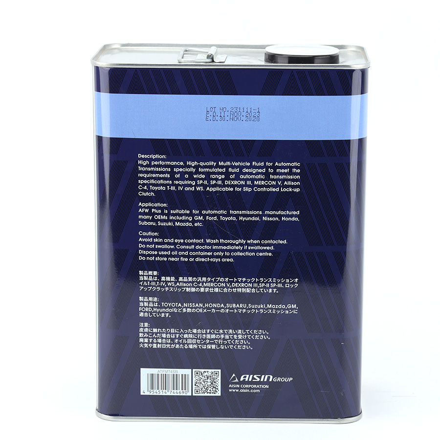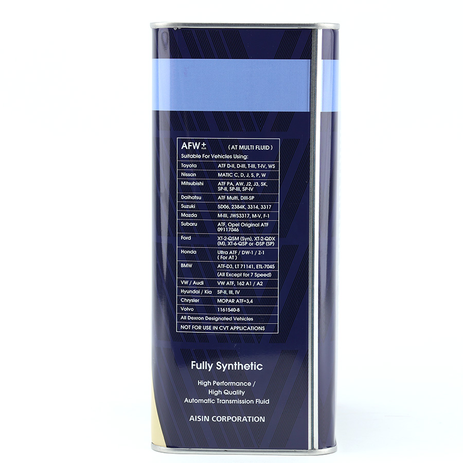 - Nhớt hộp số tự động AISIN ATFMT4S ATF+ ATF Multi 4L là một sự pha trộn đặc biệt của các thành phần nguyên liệu chất lượng cao cùng hệ thống phụ gia tiên tiến để sử dụng như một sản phẩm dầu châm, đáp ứng các yêu cầu chất lượng OEM của châu Âu như ZF-TE-ML-14A, Voith 55.6335, loại MAN 339 Type Z-1 và MB, VW, BMW 4, 5 và 6 tốc độ thông số kỹ thuật truyền động.